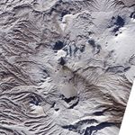 Karymsky Volcano has been erupting steadily—at least on a geologic timescale—for about 500 years. This false-color satellite image captures small explosive eruptions of ash and steam, typical activity at the volcano. A white, steam-rich plume rises above the volcano, while isolated puffs of the plume drift east-southeast. Dark ash covers white snow on the volcano’s slopes and extends across the terrain to the southeast. The image was acquired by the Advanced Reflection and Emission Radiometer (ASTER) aboard the Terra satellite on January 31, 2011.