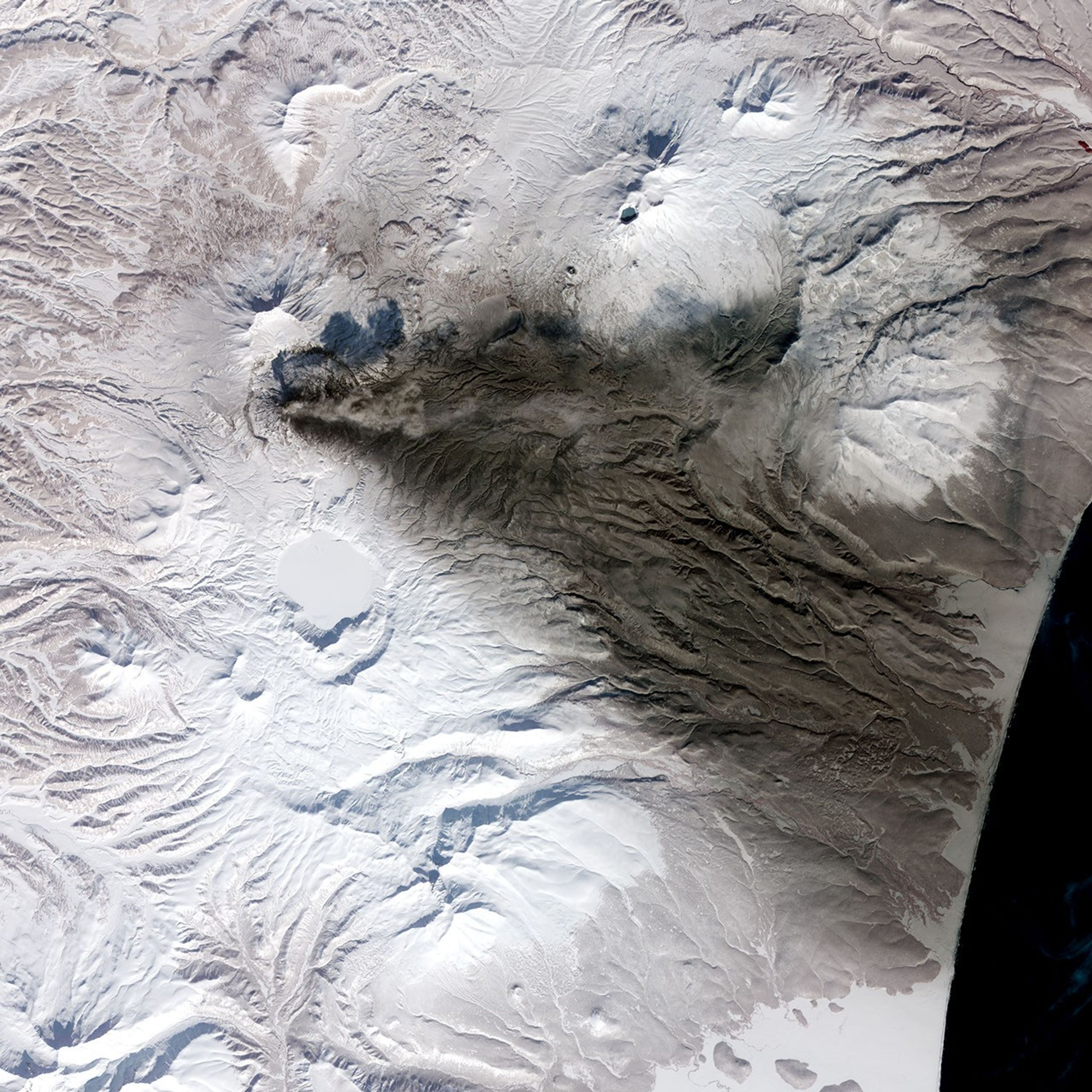 By early March 2009, Karymsky Volcano on Russia’s Kamchatka Peninsula had stained the snowy white landscape charcoal-brown all the way to the coast. The Advanced Spaceborne Thermal Emission and Reflection Radiometer (ASTER) on NASA’s Terra satellite acquired this image of the volcano on March 7, 2009. The top image is a close-up view of the smoking volcano, and the bottom image shows a wider perspective. The ash that settled on the snow rests on a rugged landscape of crests and valleys while the plume of ash overhead appears billowy, like a dark cloud. The plume’s direction mimics that of the preexisting ashfall, indicating that wind directions have not changed since this spate of ash emissions began.