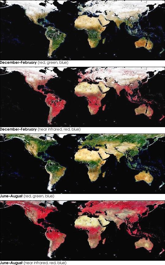 These MODIS Airborne Simulator images, acquired on June 24, 2003, show the site of the Aspen Fire in true color (top) and, using the sensor’s infrared detectors, false color (bottom). Whereas much of the surface detail is obscured by smoke in the top scene, notice how much detail on the surface is revealed in the bottom image. Untouched vegetated land surface appears green, bare rock and land surface look orange-brown, the smoldering scar left by recently-burned areas shows up as crimson, and the actively-burning fire front is the bright red-orange ribbon around the burn scar’s perimeter. The most intense fire fronts visible in this image can be seen both to the north and south of the burned area, as well as along much of the western perimeter.
