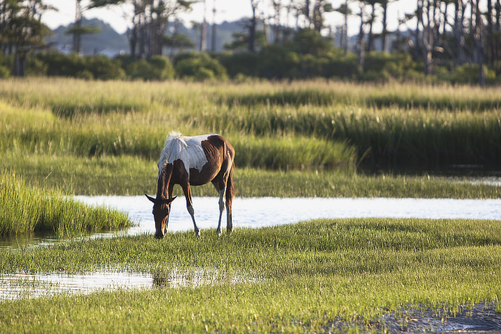 Through all of the changes, wild ponies have stuck around on the islands for several hundred years as the sand has moved under their feet. Legend has it that some of the original ponies arrived from the shipwreck of a Spanish galleon, though more likely they were left abandoned on the island by settlers and farmers. About 150 feral ponies live on the Maryland portion of Assateague and are kept relatively wild, without much human intervention. Another 150 live on the Virginia side and are owned by the Chincoteague Volunteer Fire Company, which provides medical checkups twice a year and auctions off several ponies each summer to raise money and maintain a steady population. All of the horses have adapted to eating salt marsh grasses and brush.
