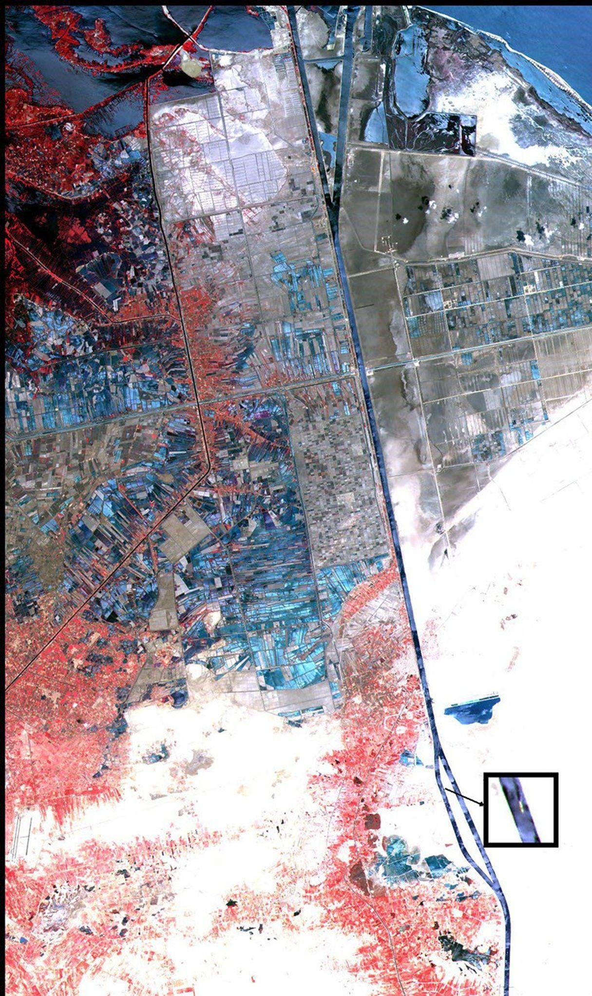 This 36 km by 60 km (22 by 37 mile) image shows the northern part of the Suez Canal, Egypt, with the Mediterranean Sea just visible in the upper right corner. This scene was acquired by the Japanese Advanced Spaceborne Thermal Emission and Reflection Radiometer (ASTER), flying aboard NASA's Terra spacecraft, on May 19, 2000.
