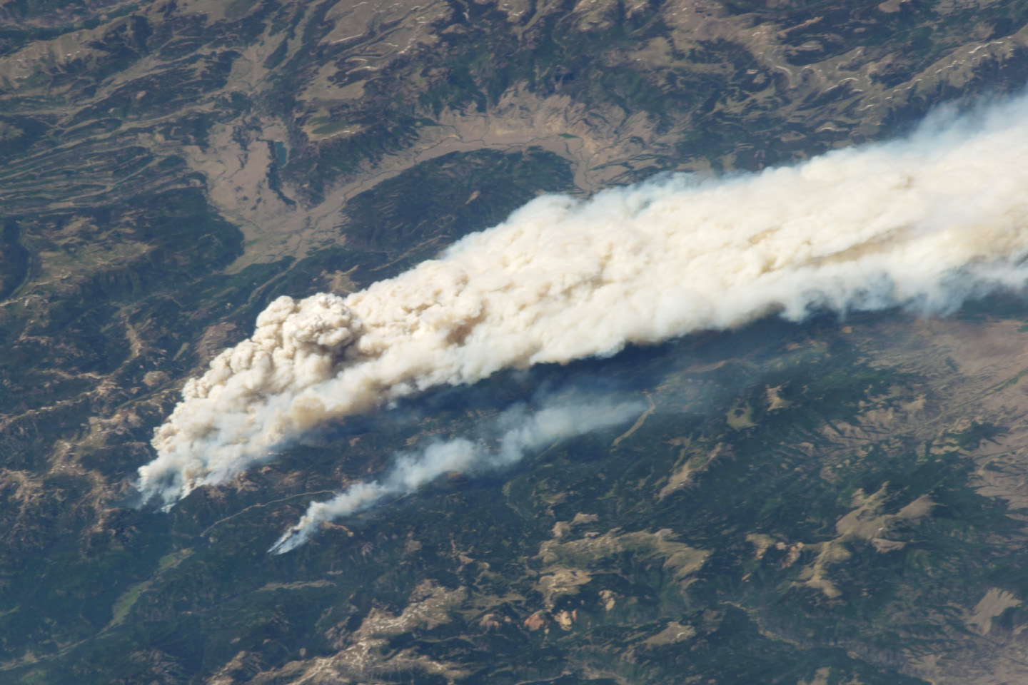 Thick smoke billows across the landscape in these digital photographs of the western United States. Both photographs were taken by astronauts aboard the International Space Station (ISS) on June 19, 2013.