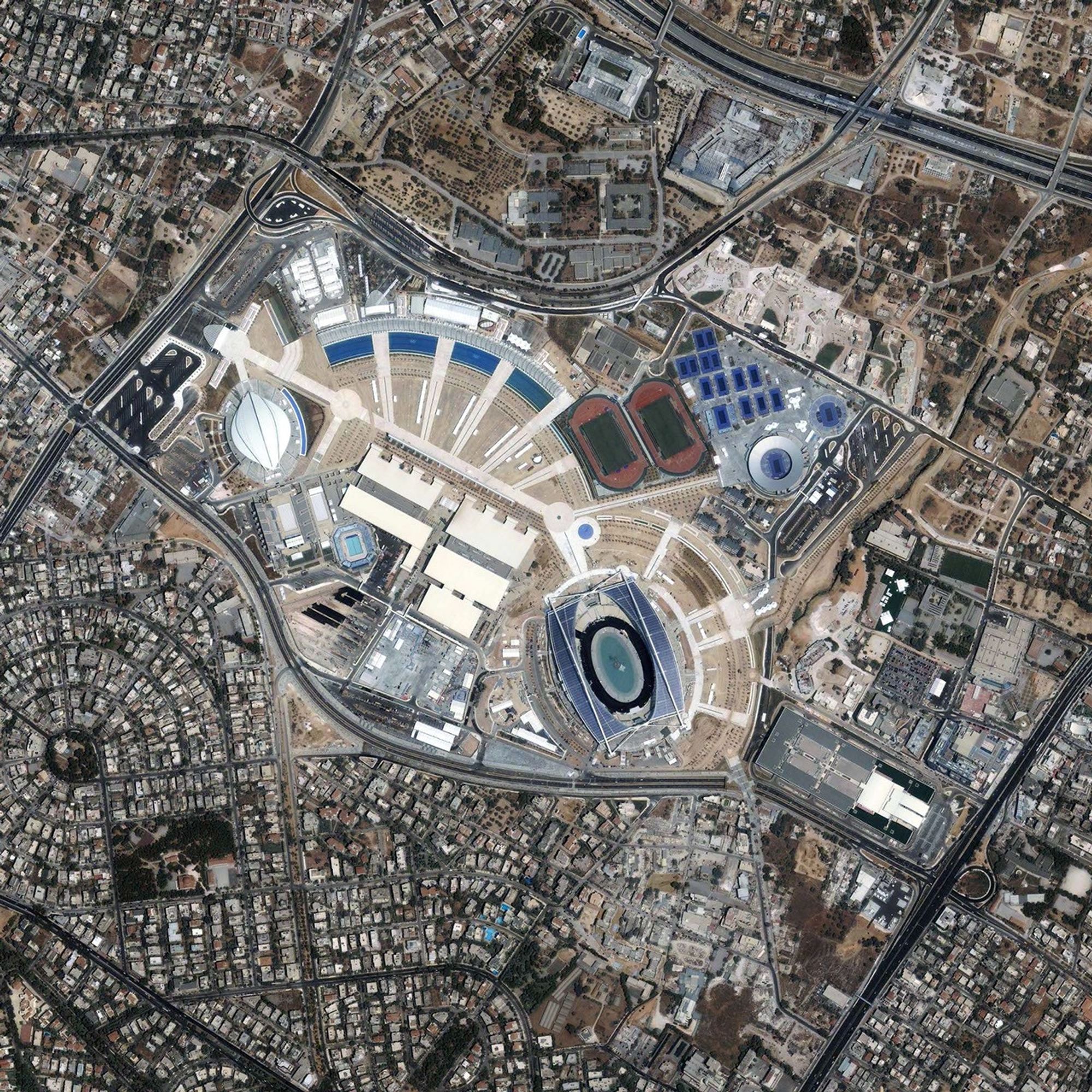 Athletes and sports fans from all over the world will soon focus their attention on Athens, Greece—host city for the 2004 Summer Olympic Games. This high-resolution image shows the Athens Olympic Sports Complex, where this year’s games will be played. Acquired on June 24, 2004, by Space Imaging’s IKONOS satellite, the scene shows the complex in stunning detail, including the Olympic Stadium (home of the opening and closing ceremonies), the Olympic Aquatic Center, Olympic Indoor Hall (gymnastics and basketball finals), Olympic Tennis Center, and the Olympic Velodrome (cycling).