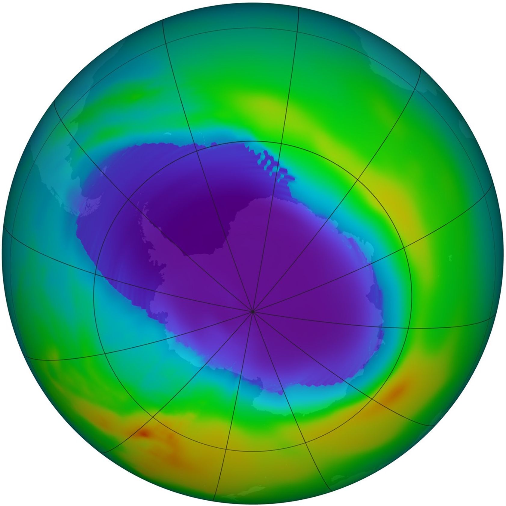 The image above is the first publicly released image from the Aura mission. Acquired by the mission’s Ozone Monitoring Instrument (OMI) on September 22, 2004, the image shows dramatically depleted levels of ozone in the stratosphere over Antarctica. Purple shows areas with very low ozone concentrations (as low as 125 dobson units), while turquoise, green, and yellow show progressively higher ozone concentrations.