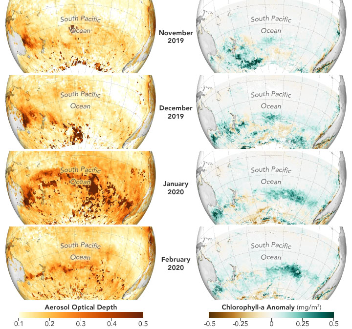 The maps above show the monthly aerosol levels (left) and chlorophyll anomalies (right) from November 2019 to February 2020. The researchers identified two regions south and east of Australia where chlorophyll concentrations were double the normal seasonal levels—values never before observed in the 22-year satellite record. Those chlorophyll anomalies occurred within a few days to weeks after the peaks in black carbon aerosols. In those two regions, black carbon aerosol values were also 300 percent higher than normal, a level unprecedented in the 17-year aerosol record.