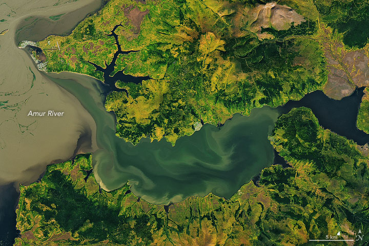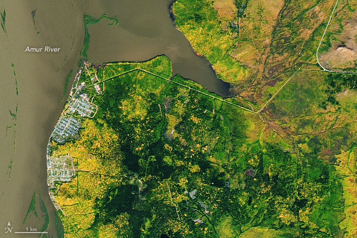 The Operational Land Imager on Landsat 8 acquired these images on September 30, 2019. They show three locations along a 120-kilometer stretch of the lower Amur, northeast of Komsomolsk-on-Amur in the Russian Far East.