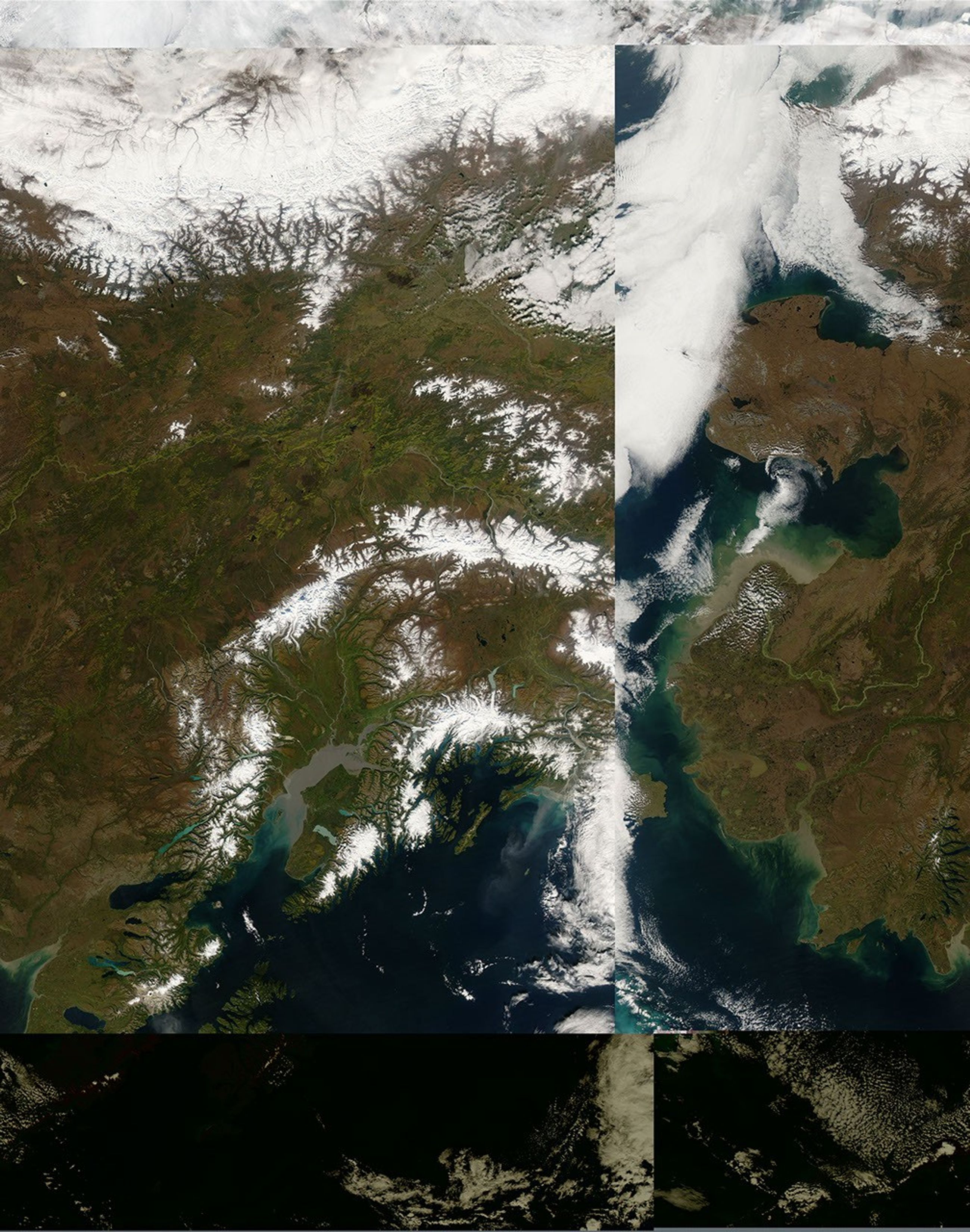 This image was captured by the Moderate Resolution Imaging Spectroradiometer (MODIS) on the Aqua satellite. The large image provided above shows a wider area in better detail; the scene extends all the way north to the Brooks Range and Alaksa’s Northern Slope and southward along several hundred kilometers of the Alaska Peninsula.