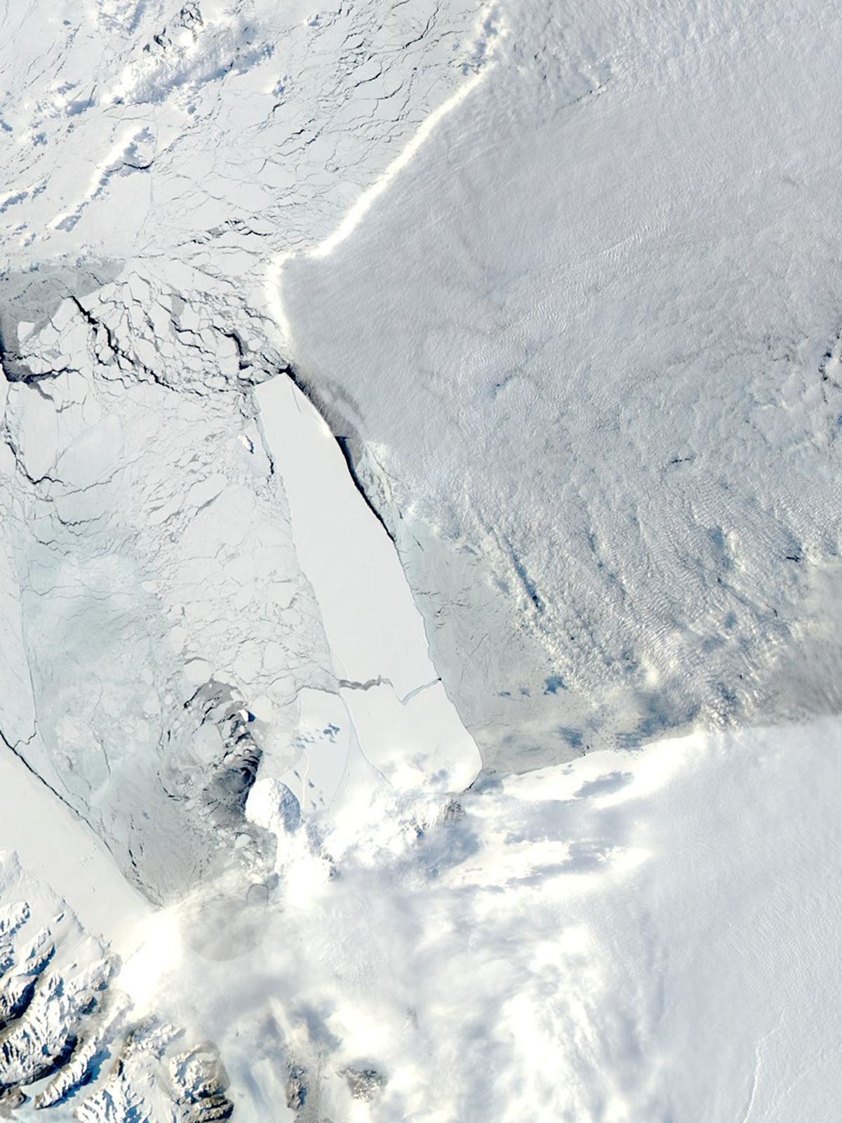The Ross Ice Shelf is a vast field of snow and ice extending from the continent into the Ross Sea on the western Pacific coast of Antarctica. As glaciers slide off the continent and push the shelf out, the outer edges crumble into a myriad of icebergs such as B-15A.