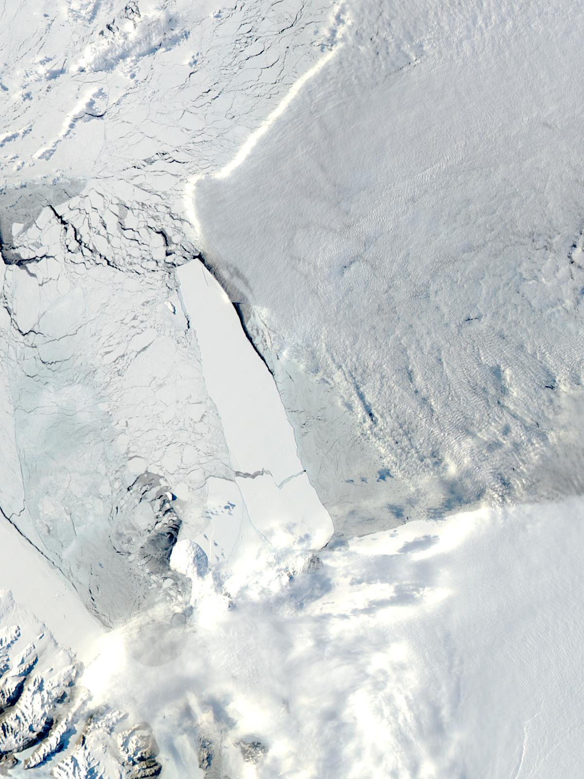 A massive iceberg that had been blocking traditional shipping routes to McMurdo Station, the National Science Foundation’s research station in Antarctica, snapped in two seemingly overnight. The B-15A iceberg seemed to be intact in the Terra MODIS image recorded on October 7, 2003. But this true-color Moderate Resolution Imaging Spectroradiometer (MODIS) image captured by the Terra satellite on October 9 shows the iceberg in two pieces. The largest section, top, is about 75 miles long, and the shorter section is 20-25 miles long.