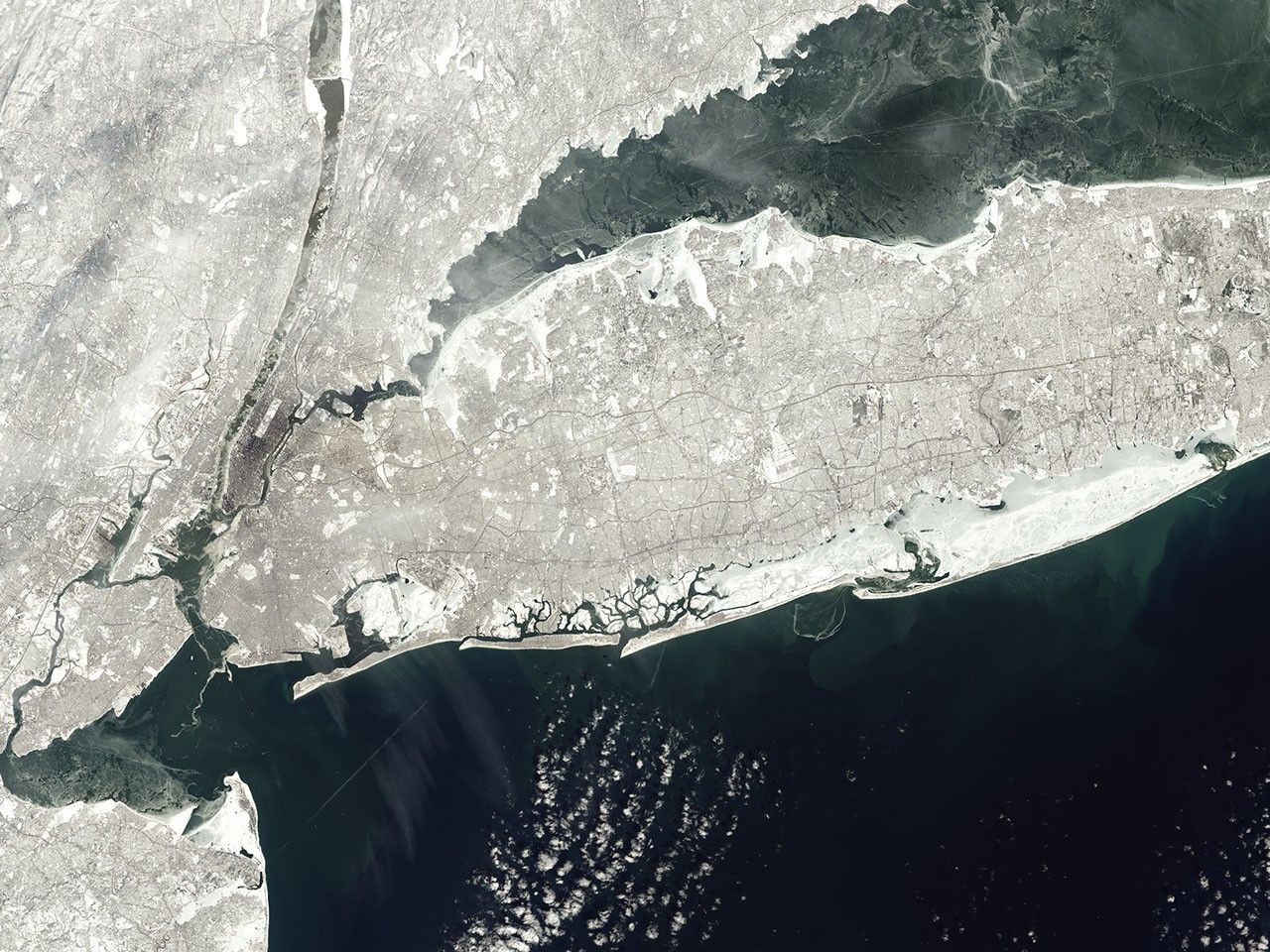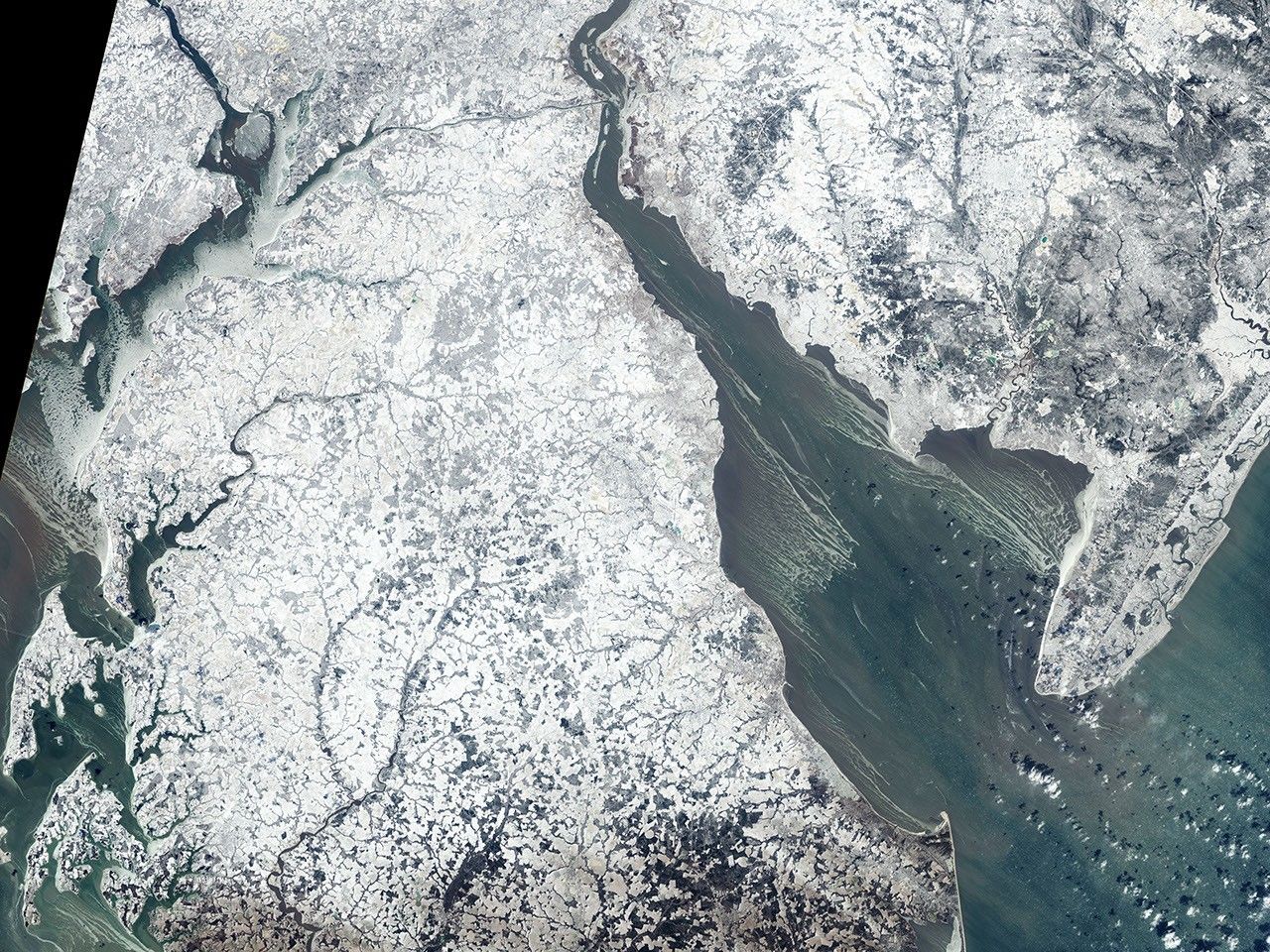 Several satellites captured views of the frozen landscape from above, observing saltwater sea ice in East Coast harbors and freshwater ice in the Great Lakes and other inland waterways. Snow and ice have blanketed land surfaces from the Mississippi River to the Atlantic Ocean, from the Carolinas to Maine.