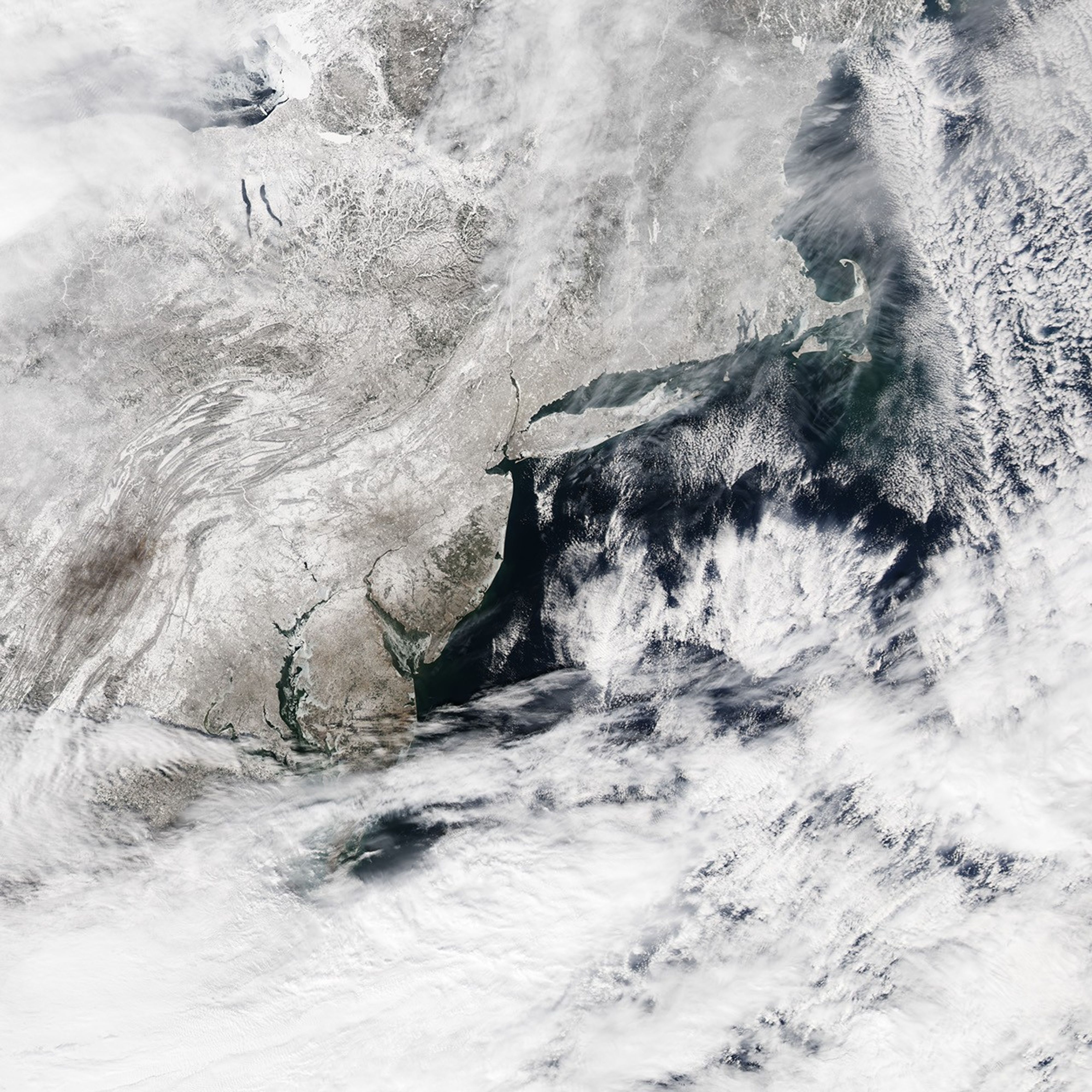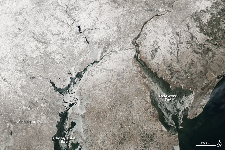 Several satellites captured views of the frozen landscape from above, observing saltwater sea ice in East Coast harbors and freshwater ice in the Great Lakes and other inland waterways. Snow and ice have blanketed land surfaces from the Mississippi River to the Atlantic Ocean, from the Carolinas to Maine.