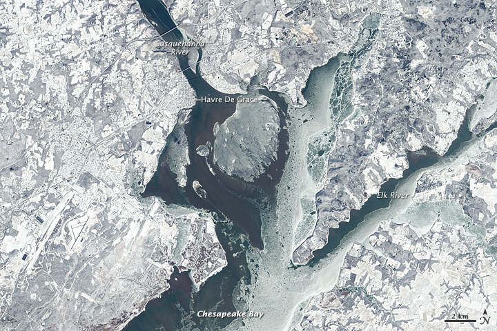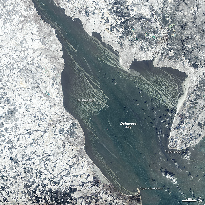 Below you can see a trio of images showing the Mid-Atlantic region. The first image was captured on February 24 by the Moderate Resolution Imaging Spectroradiometer (MODIS) on NASA’s Aqua satellite. It shows ice in Delaware Bay—between New Jersey, Pennsylvania, and Delaware—and in the northern end of the Chesapeake Bay between Maryland and Delaware. The following two images (from February 15) come from the Landsat 8 OLI and show closer views, including ice streamers.