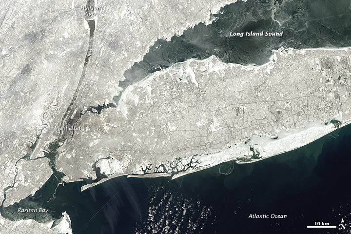 The waters around New York City have been choked with ice as well, slowing ferry and ship traffic in one of the United States’ major sea ports. The Landsat 8 image below (February 24) shows ice extending far up the Hudson River, across Long Island Sound, and into New Jersey’s Raritan Bay.