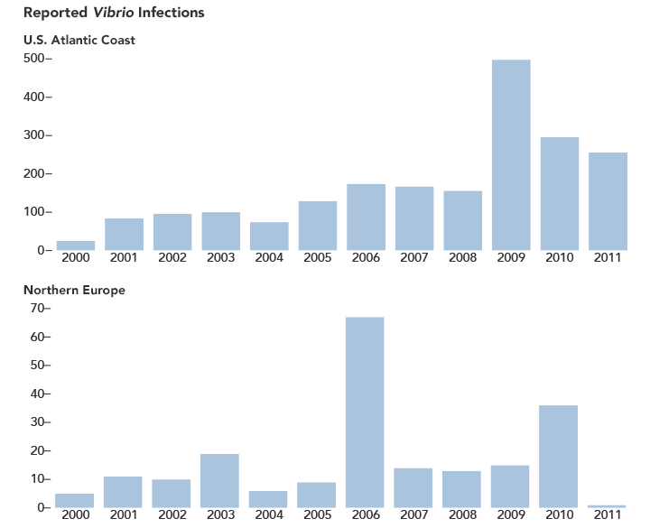 The map above, based on data from the UK Met Office Hadley Center, shows how surface temperatures in the North Atlantic Ocean changed between the period from 1890–1958 and the period from 2000–2011. Dark orange and red areas saw the most warming. The warming water coincides a rising abundance of Vibrio, changes in climate, and an increase in the reported cases of vibriosis, which the scientists say indicates a direct correlation.