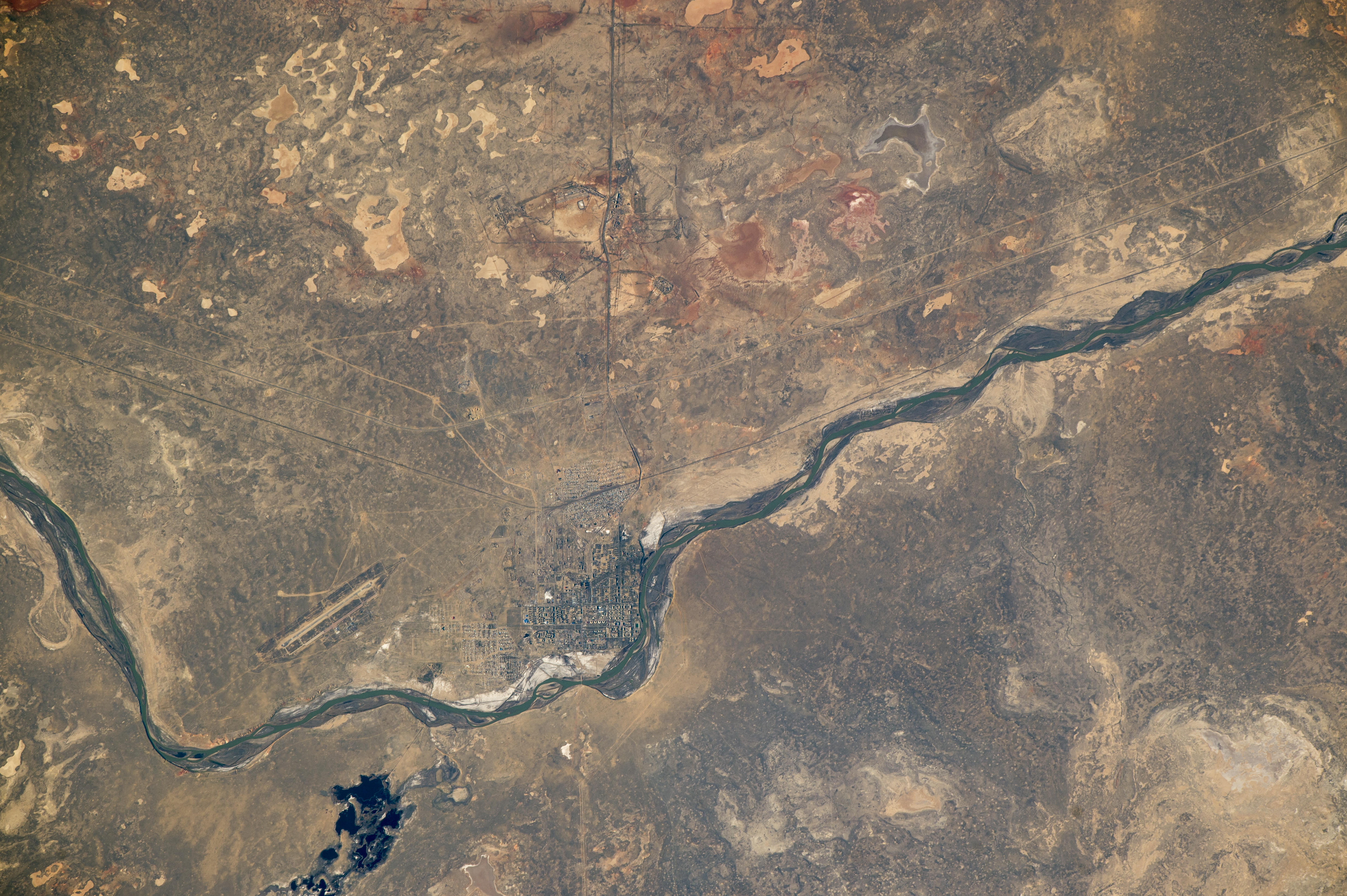 The dark areas at image lower left are wetlands that indicate the old bed of the Syr Darya—where the river used to flow in a more southerly course to the Aral Sea. The semi-desert landscape around Baikonur is a mix of dry lakes, sand dunes, and vegetation-free patches of dirt and bare rock.