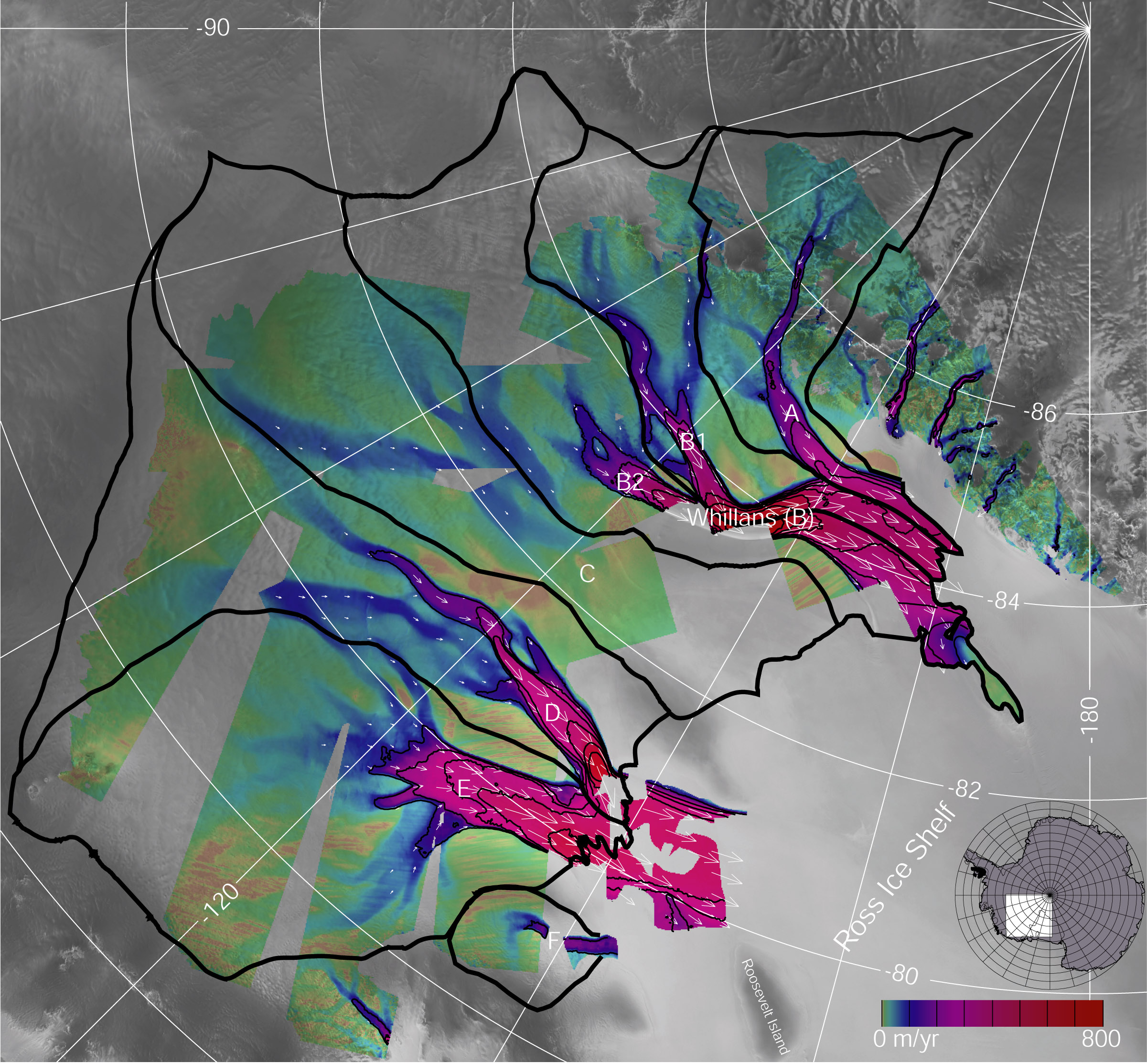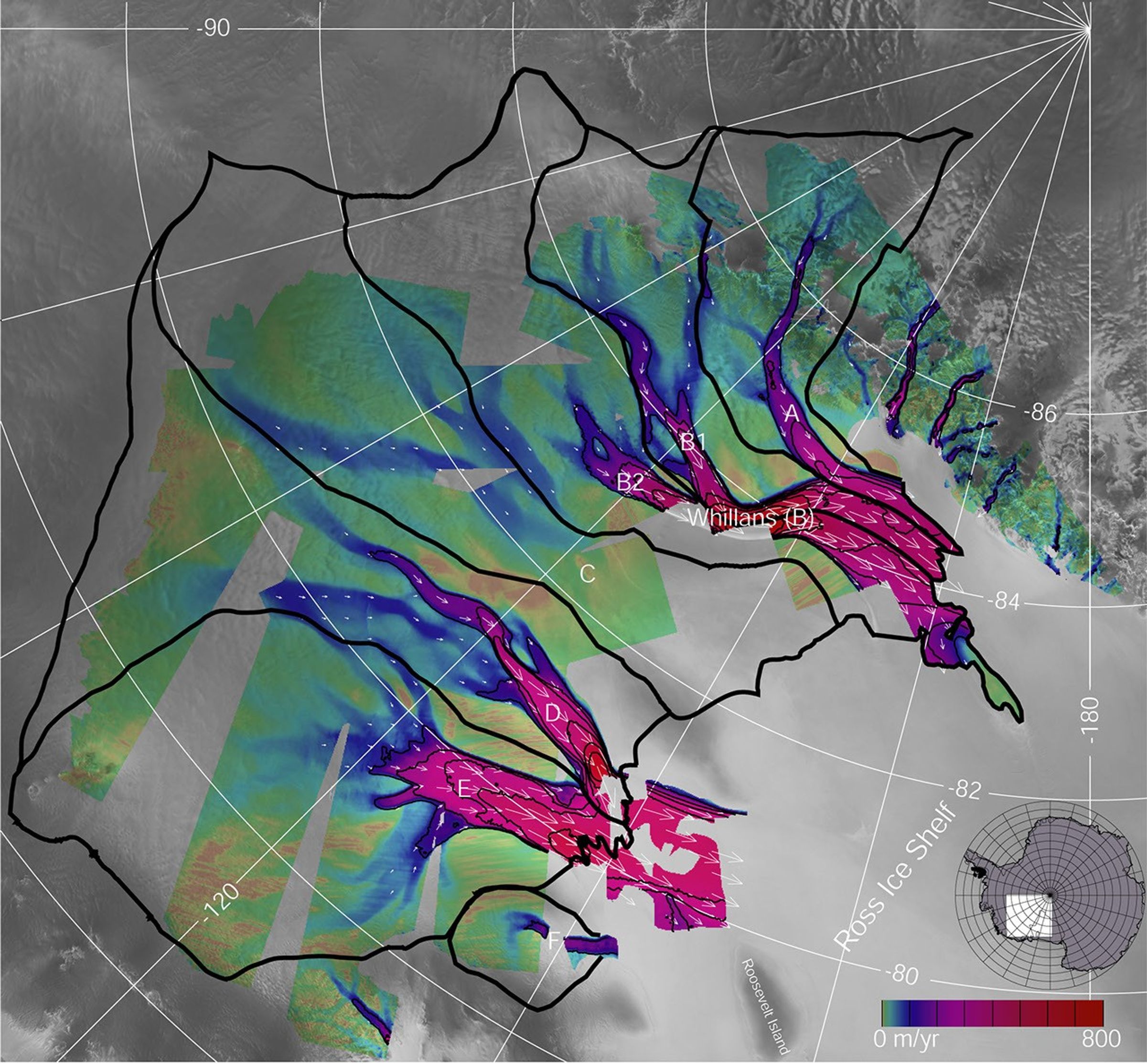 The image above depicts the region of West Antarctica where scientists measured ice speed. The fast-moving central ice streams are shown in red. Slower tributaries feeding the ice streams are shown in blue. Green areas depictslow-moving, stable areas. Thick black lines depict the areas that collect snowfall to feed their respective ice streams.
