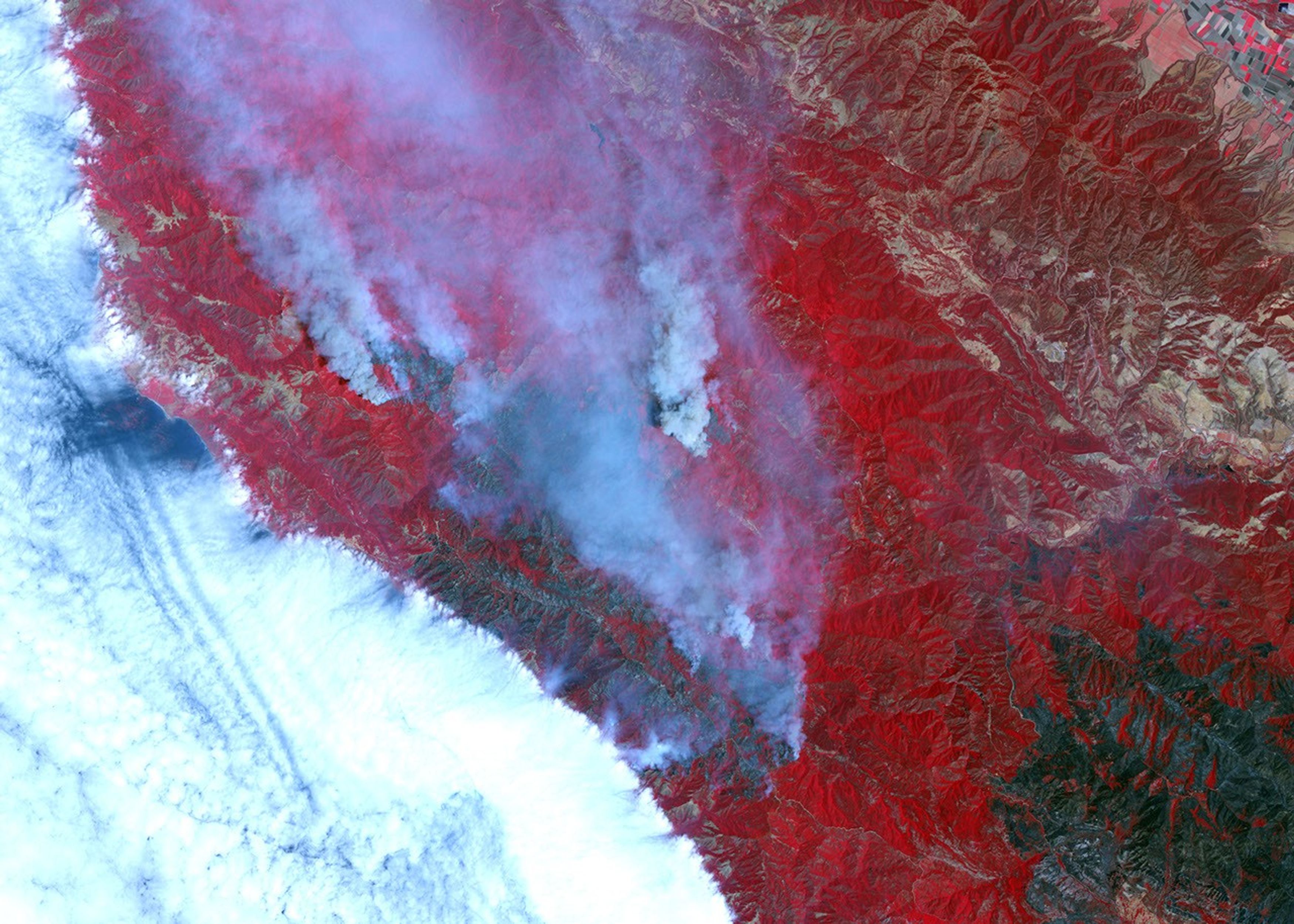 This false-color image of the Santa Lucia Range Mountains near Big Sur, California, was captured by Advanced Spaceborne Thermal Emission and Reflection Radiometer (ASTER) on NASA’s Terra satellite on June 29, 2008. Vegetation is red, naturally bare ground is tan, burned ground is charcoal colored, and smoke is light blue. Clouds over the Pacific Ocean to the southwest are bright bluish white.