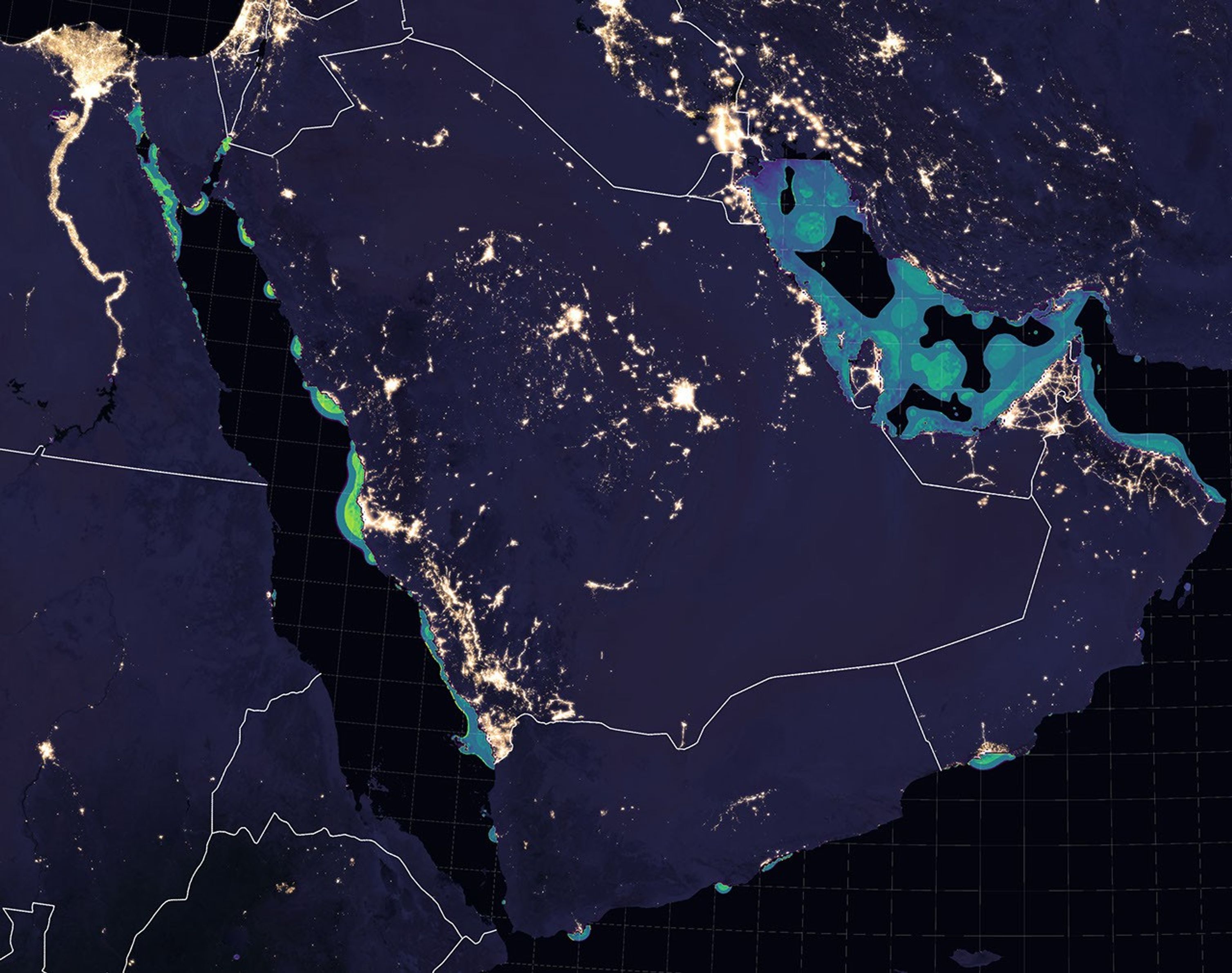 Some of the most extensive marine light pollution occurs in areas where offshore oil and gas platforms, wind farms, and island development brighten the night above and below the water line. The maps above show the North Sea in April and the Persian Gulf in December. They include both sky brightness above water and the critical depth to which underwater light is reaching. (Note the different scales for each.)