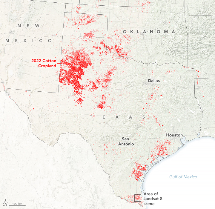 The map above shows cotton-growing areas within Texas (in red) in 2022. The map was built using 2022 the Cropland Data Layer product provided by the National Agricultural Statistics Service, which includes data from the USGS National Land Cover Database and from satellites such as Landsat 8, ResourceSat-2, and Sentinel-2.