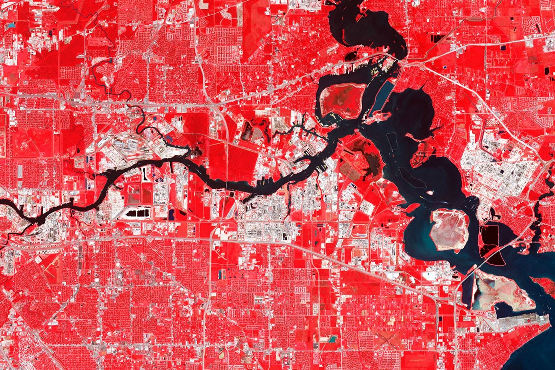 North of Galveston Bay and near the mouth of the San Jacinto River, Baytown is home to the largest oil refinery in the United States. On October 1, 2003, the Advanced Spaceborne Thermal Emission and Reflection Radiometer (ASTER) on NASA’s Terra satellite captured this image of Baytown, Texas. ASTER combines infrared, red, and green wavelengths of light to make false-color images that distinguish between water and land. Water is blue; buildings and paved surfaces appear tan and gray; and vegetation is red, with brighter shades indicating more robust vegetation.