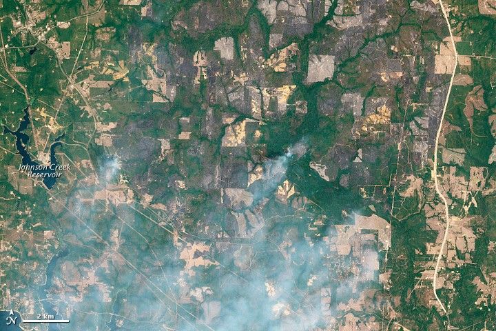 These images show that the fire has burned a substantial area, but not uniformly. Paths of unburned vegetation divide irregularly shaped burn scars—especially visible in the false-color image. Lingering smoke is more easily seen in the natural-color image.