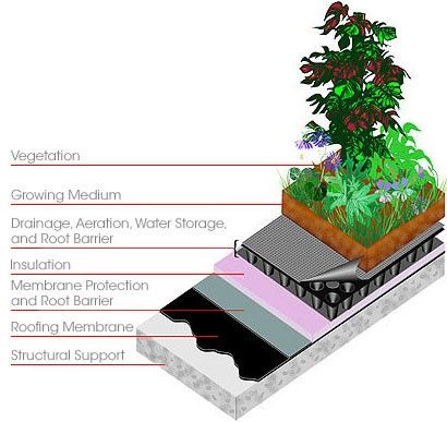 Vegetation-covered roofs typically include the following layers: a waterproof membrane at the bottom, a layer of drainage materials, a root-repellant and filter layer, a lightweight soil-like growing medium, and finally the plants. Compared to standard roofs, green roofs do have more mass, but thin systems of only 3 to 4 inches (7.5 to 10 centimeters) are sufficient. When they are saturated with rainwater, they may create a load of 1,197 pascals (about 25 pounds per square foot), which is often feasible for many city buildings. By evaporating moisture, the plants release heat without raising local temperatures. Likewise, the plants and soil soak up rainfall like a sponge instead of letting it roll right off the surface.