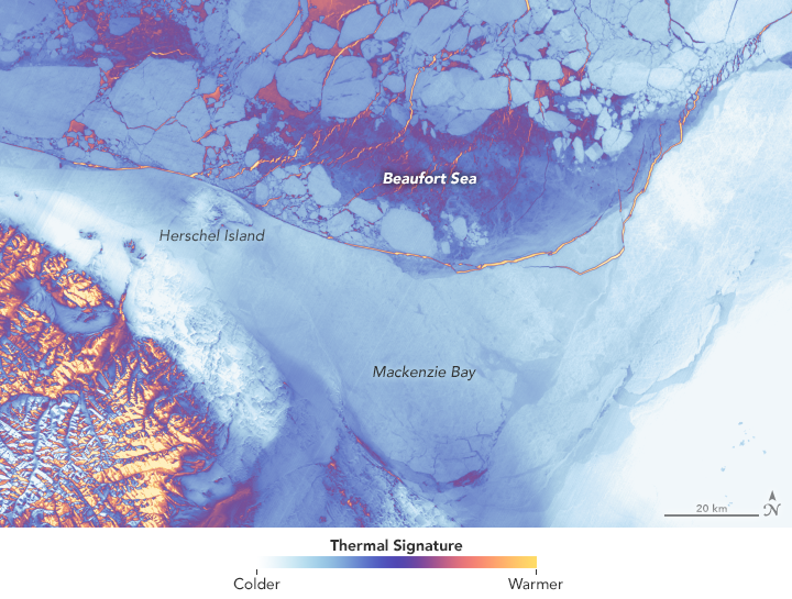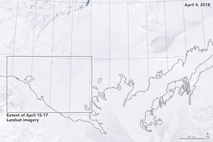 As the sea ice thins and fractures, you can also see that warmth is also coming from ocean water below the ice. The Thermal Infrared Sensor (TIRS) on Landsat 8 captured the data for this false-color image on April 15 and 17. It shows the relative warmth or coolness of the landscape. Orange depicts where surfaces are the warmest—areas of open ocean or thin sea ice. Light blues and whites are the coldest areas, which includes the fast ice and the larger, thicker floes.