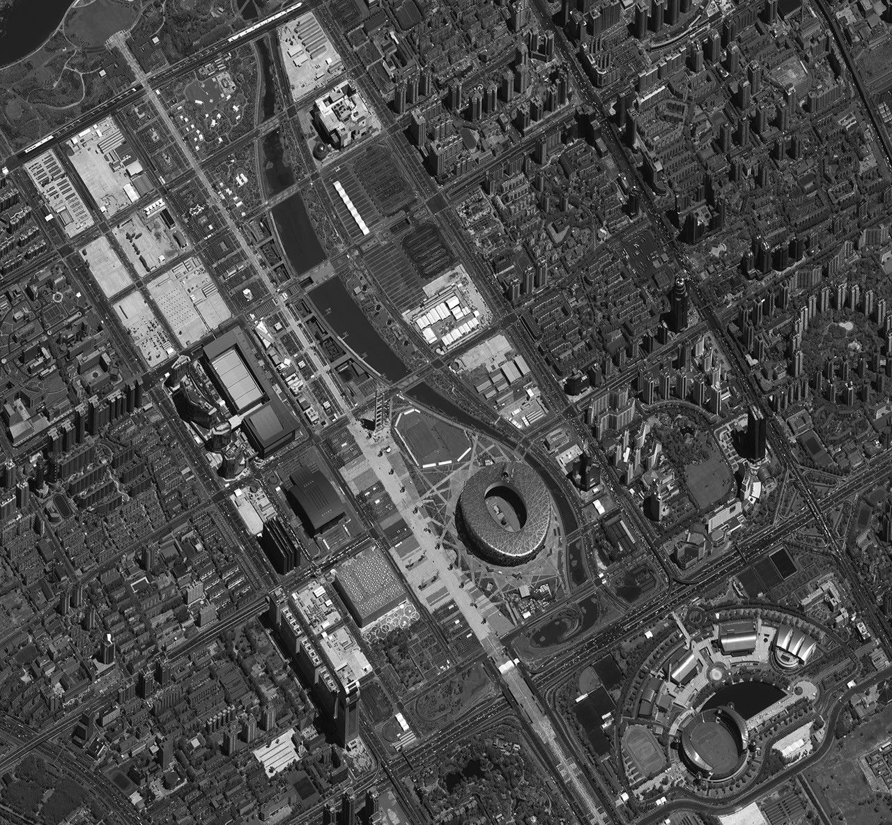 Known as the “Bird’s Nest” for its unique architecture, the Beijing National Stadium is the iconic center point of the Beijing 2008 Olympic Games. The elliptical stadium holds 91,000 people and will host the opening and closing ceremonies, all track and field events, and soccer finals from August 8 through August 24, 2008. DigitalGlobe’s WorldView-1 satellite captured this detailed view of the Bird’s Nest on July 12, 2008, two weeks after the stadium was officially completed and opened.