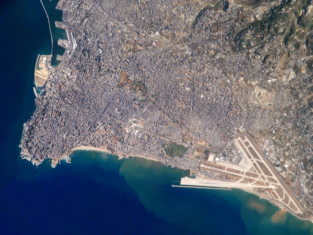 The Beirut area has a long human history. It has been an urban center for the past 5,000 years. Throughout much of that time, the region has been the focus of both military and economic conflicts among neighboring city-states. Conflict between Lebanon and Israel in 2006 resulted in environmental damage from an oil spill that affected local beaches. Beach contamination from the oil spill is not visible in this astronaut photograph taken in 2007. Other distinctive features visible in this astronaut photograph include the Rafic Hariri Airport at image lower right, the city sports arena at image center, and several areas of green and open space, including a large golf course at image center. Also visible in the image are several plumes of sediment along the coastline; the most striking plumes are near the airport. The general lack of vegetation in the airport may allow more soil transport by surface water runoff or wind.