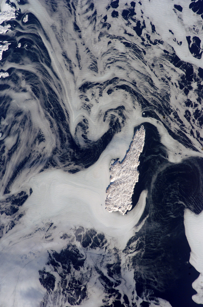 Belle Isle (center) is surrounded by sea ice in this recent winter view taken from the International Space Station. Belle Isle lies in the Belle Isle Strait between the island of Newfoundland and the Labrador mainland (together the two are officially known as the province of Newfoundland and Labrador.) A portion of a small island along the coast of Labrador appears in the top left corner.