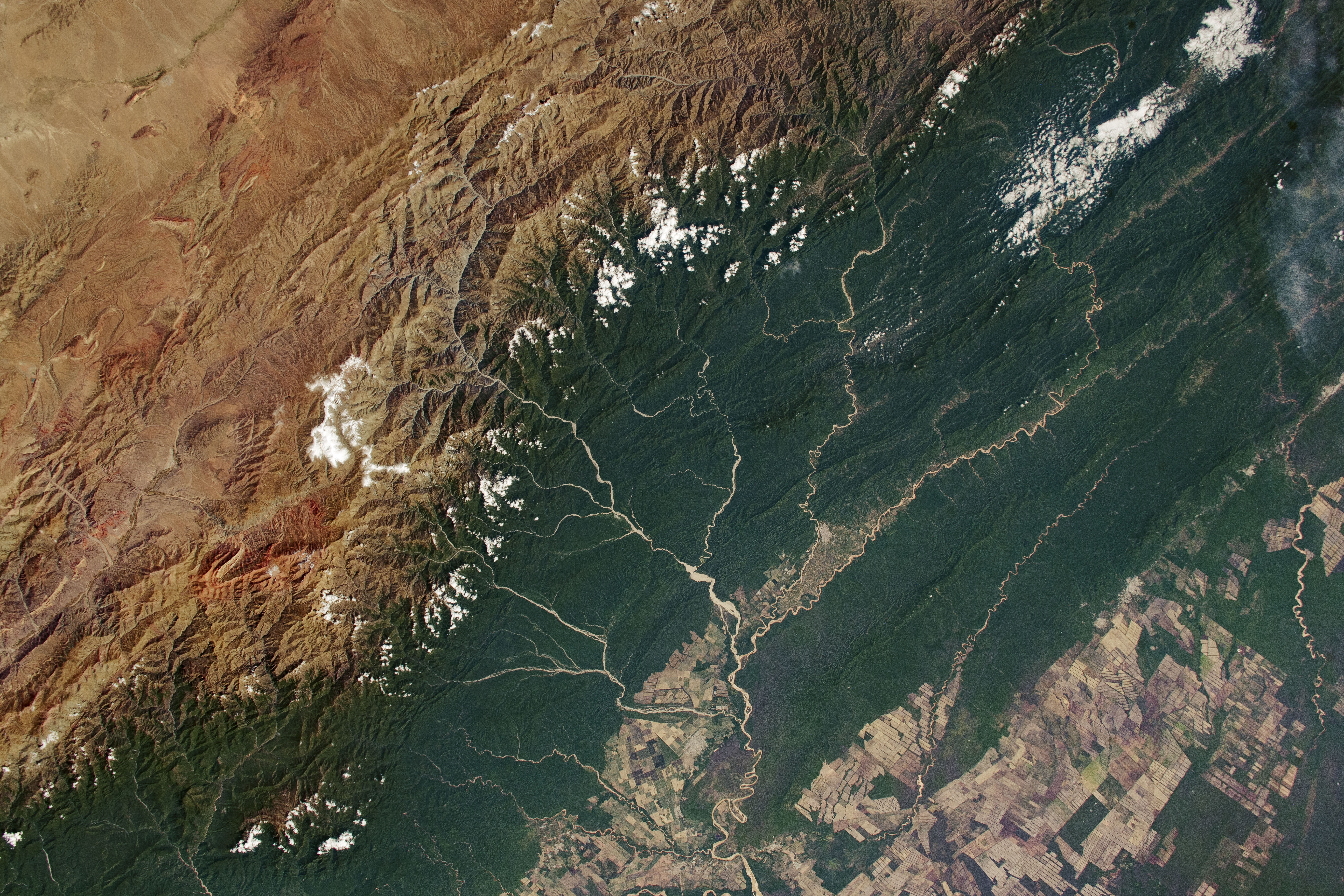 The divide between lush forest and desert is striking in this photograph taken by an astronaut onboard the International Space Station (ISS). Meandering rivers and farmland comprise most of the lower right half of the photo, while the upper left shows part of the Atacama Desert just beyond the Andes Mountains.