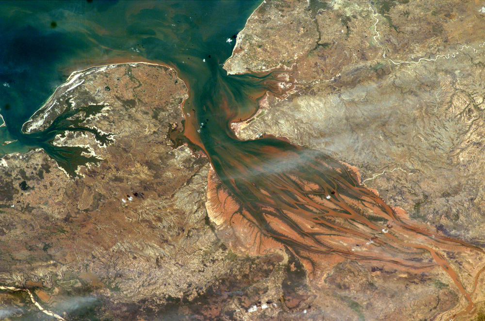 The Betsiboka Estuary on the northwest coast of Madagascar is the mouth of Madagascar’s largest river and one of the world’s fast-changing coastlines. Nearly a century of extensive logging of Madagascar’s rainforests and coastal mangroves has resulted in nearly complete clearing of the land and fantastic rates of erosion. After every heavy rain, the bright red soils are washed from the hillsides into the streams and rivers to the coast. Astronauts describe their view of Madagascar as “bleeding into the ocean.” One impact of the extensive 20th century erosion is the filling and clogging of coastal waterways with sediment—a process that is well illustrated in the Betsiboka estuary. In fact, ocean-going ships were once able to travel up the Betsiboka estuary, but must now berth at the coast.