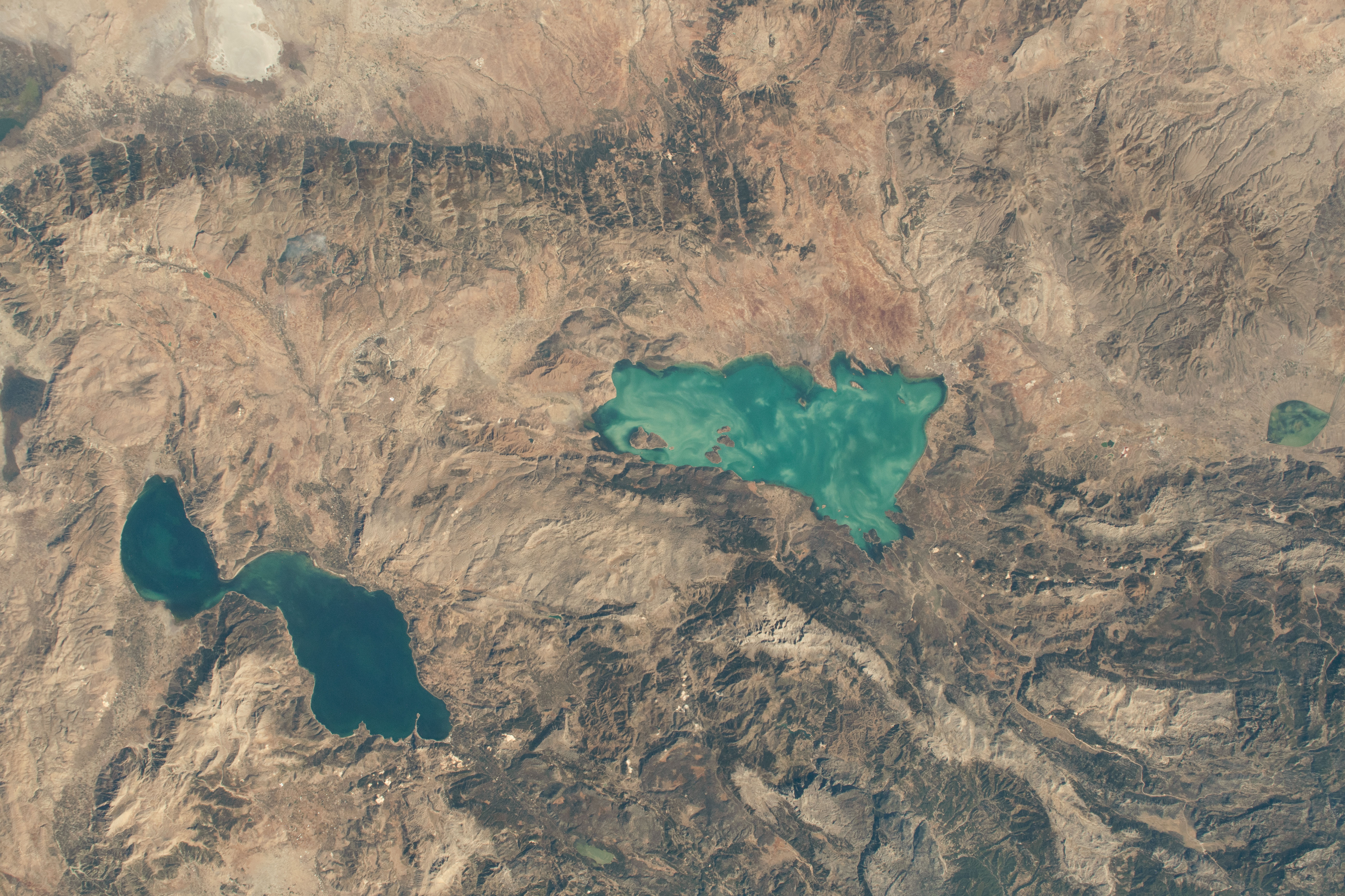 Two of the largest freshwater lakes in Turkey are featured in this photograph, taken by an astronaut from the International Space Station (ISS). Lake Beysehir and Lake Egirdir are situated in the Turkish Lakes Region, a highly active tectonic area on the Anatolia Plateau.