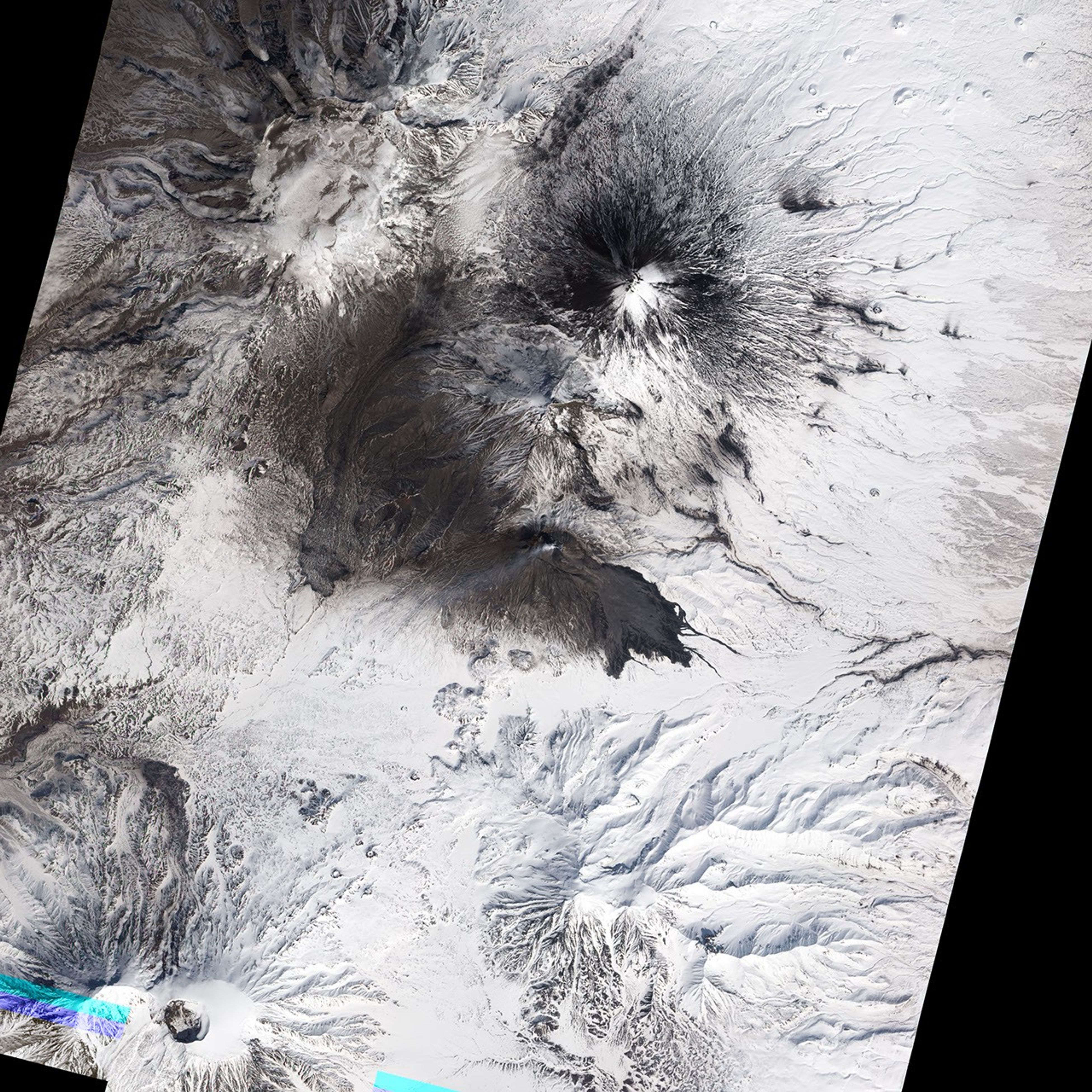 Russia’s Bezymianny Volcano erupted vigorously on the morning of April 14, 2011. At the time of the eruption, the Joint Air Force & Army Weather Information Network reported ash at an altitude of 25,000 feet (7,600 meters) above the volcano. This natural-color satellite image (top) shows evidence of the size of the eruption. Dark volcanic deposits (likely a combination of pyroclastic flows and lahars) extend more than 7.3 kilometers (4.5 miles) into valleys to the southeast. A light-colored plume of ash, steam, and sulfur dioxide rises above Bezimianny’s summit and blows towards the west. Volcanic ash covers the upper slopes of the volcano, especially to the south and west. White snow, still deep in late April, blankets the surrounding landscape.