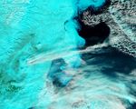 The Moderate Resolution Imaging Spectroradiometer (MODIS) on the Terra satellite captured this natural-color image (above, top) about an hour and a half later. A pale ash plume extends east of Bezymianny. The plume is easier to see in the false-color image (above, lower), which is a combination of shortwave infrared, infrared, and red light. In the false-color image snow is cyan, vegetation is bright green, and clouds are white. The orange dot on Bezymianny Volcano is hot volcanic material.