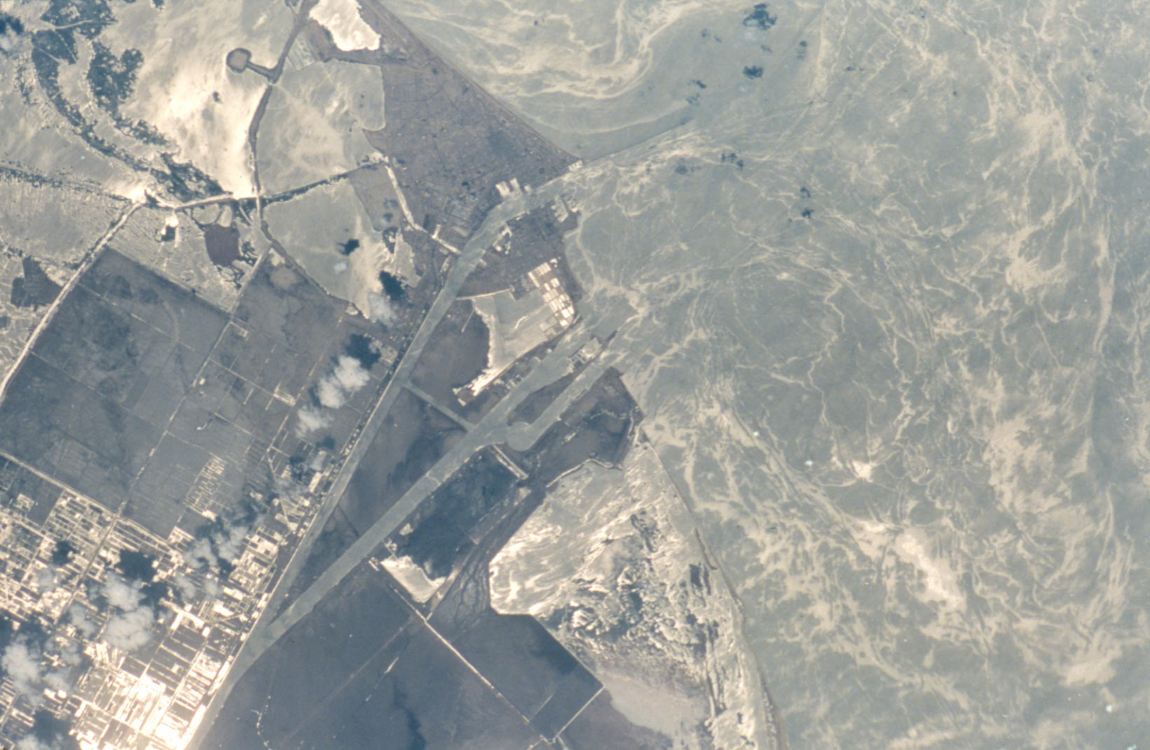 Astronauts aboard the Space Shuttle Discovery used the sunglint off the surface of the Mediterranean Sea to reveal biogenic films on the ocean surface. ("Biogenic film" refers to a thin layer of biologically-produced film resting on the surface. Click for more details.) The films dampen surface capillary waves, creating brighter and darker reflections, which, in turn, trace the complex surface water movements along the coast. The sunglint also highlights coastal features (jetties, submerged coastal areas) near the Port of Suez.