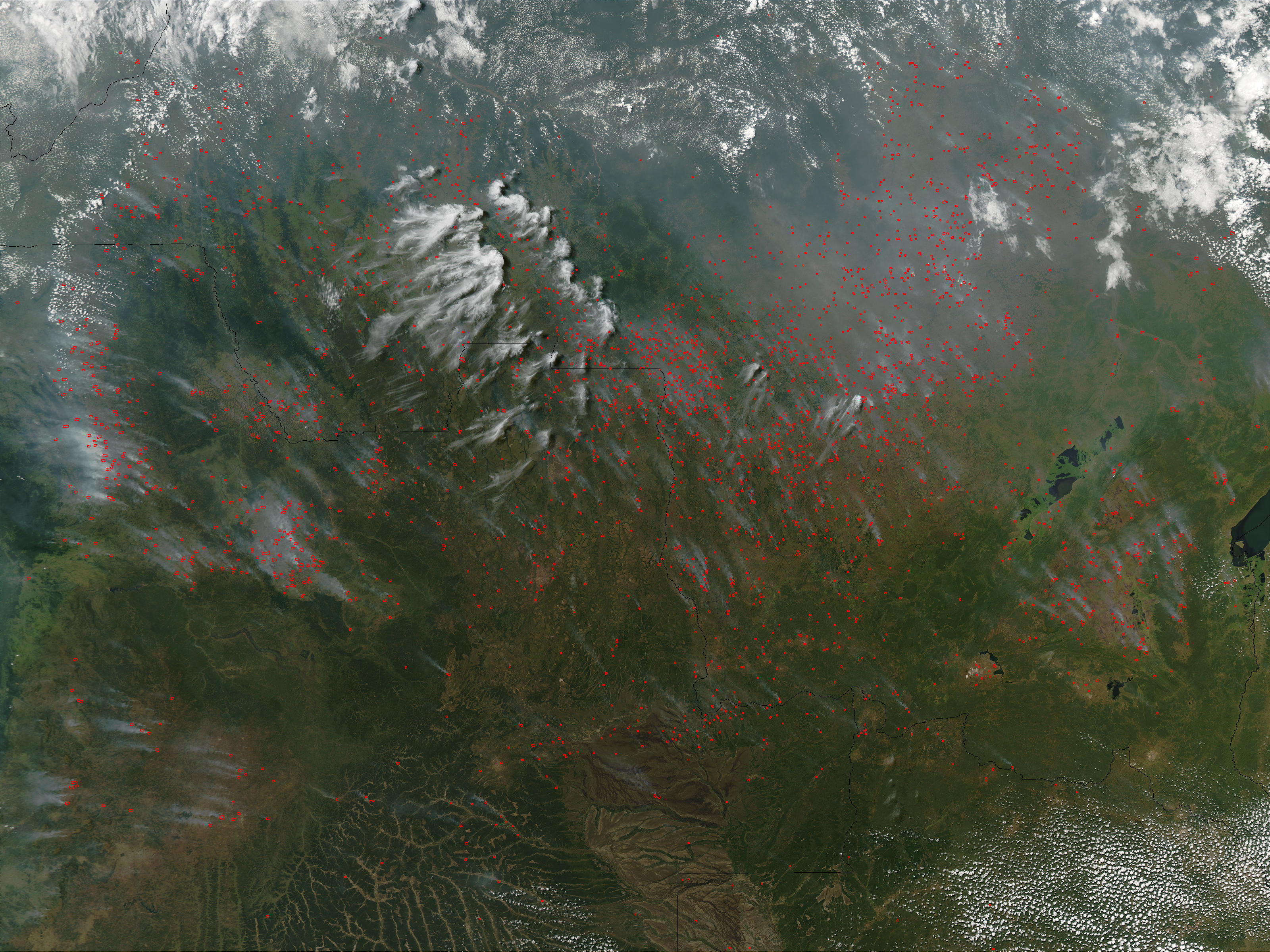 The biomass burning season in southern Africa appears firmly underway in this true-color Moderate Resolution Imaging Spectroradiometer (MODIS) from the Aqua satellite on May 8, 2003. Thousands of fires were detected by MODIS across Democratic Republic of Congo (top) and Angola (bottom) and are marked with red dots. The top of the image is clouded with smoke.