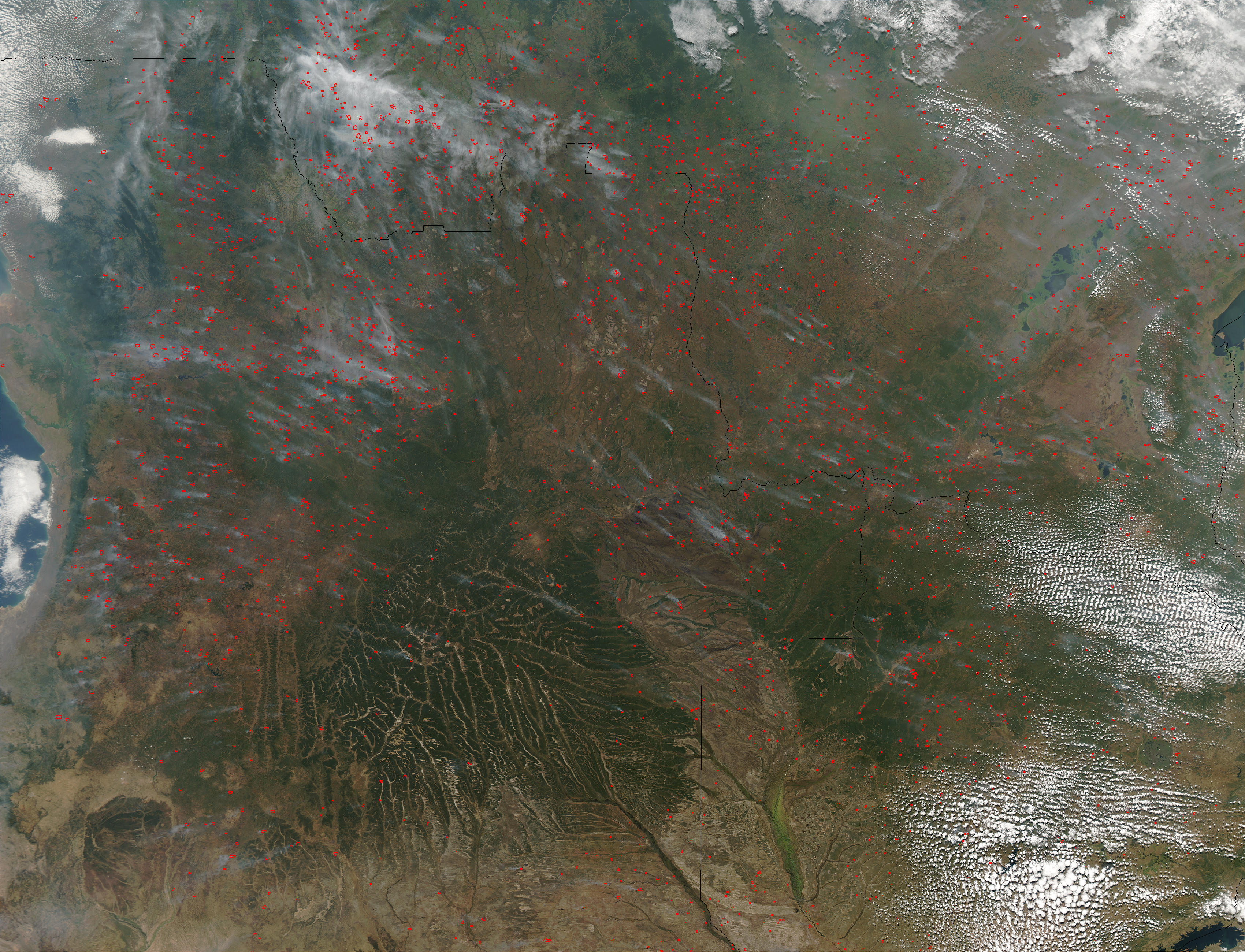 Thousands of fires are burning across central and southern Africa in mid-June 2003, and have been detected by the Moderate Resolution Imaging Spectroradiometer (MODIS) on the Aqua satellite. Active fire locations have been marked with red dots in this smoky image from June 16, 2003. The image spans Democratic Republic of Congo (top), and parts of Angola (left) and Zambia (bottom right). There is an especially smoky concentration of fires left of center at the top of the image, which is the southern Bandundu region of Democratic Republic of Congo. At bottom, the dark green area crisscrossed by dozens of tan lines is the deeply carved Angola Plateau, which drops off to the Liuwa Plain in Zambia, through which runs the Zambezi River.
