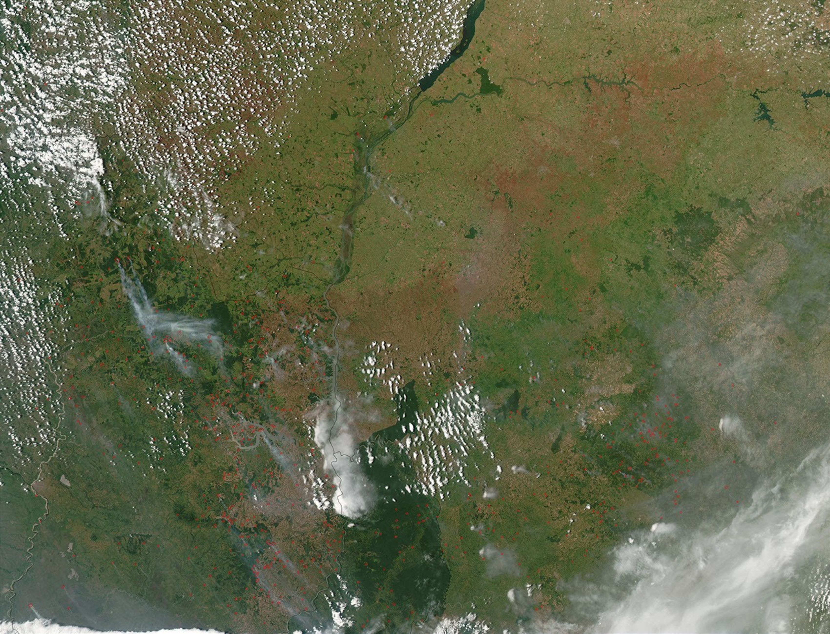 On November 9, 2002, the Moderate Resolution Imaging Spectroradiometer (MODIS) on the Aqua satellite captured this true-color image of southeastern Paraguay (bottom left), Brazil (top and right), and far northeastern Argentina (bottom center). Numerous fires were detected by MODIS and marked with red dots. The Misiones region of Argentina pictured at bottom center contains some of the last remaining areas of a tropical rainforest ecosystem called the Atlantic Forest—a rainforest distinct from the Amazon farther north, and now almost completely gone. Notice how green the region appears compared the surroundings.