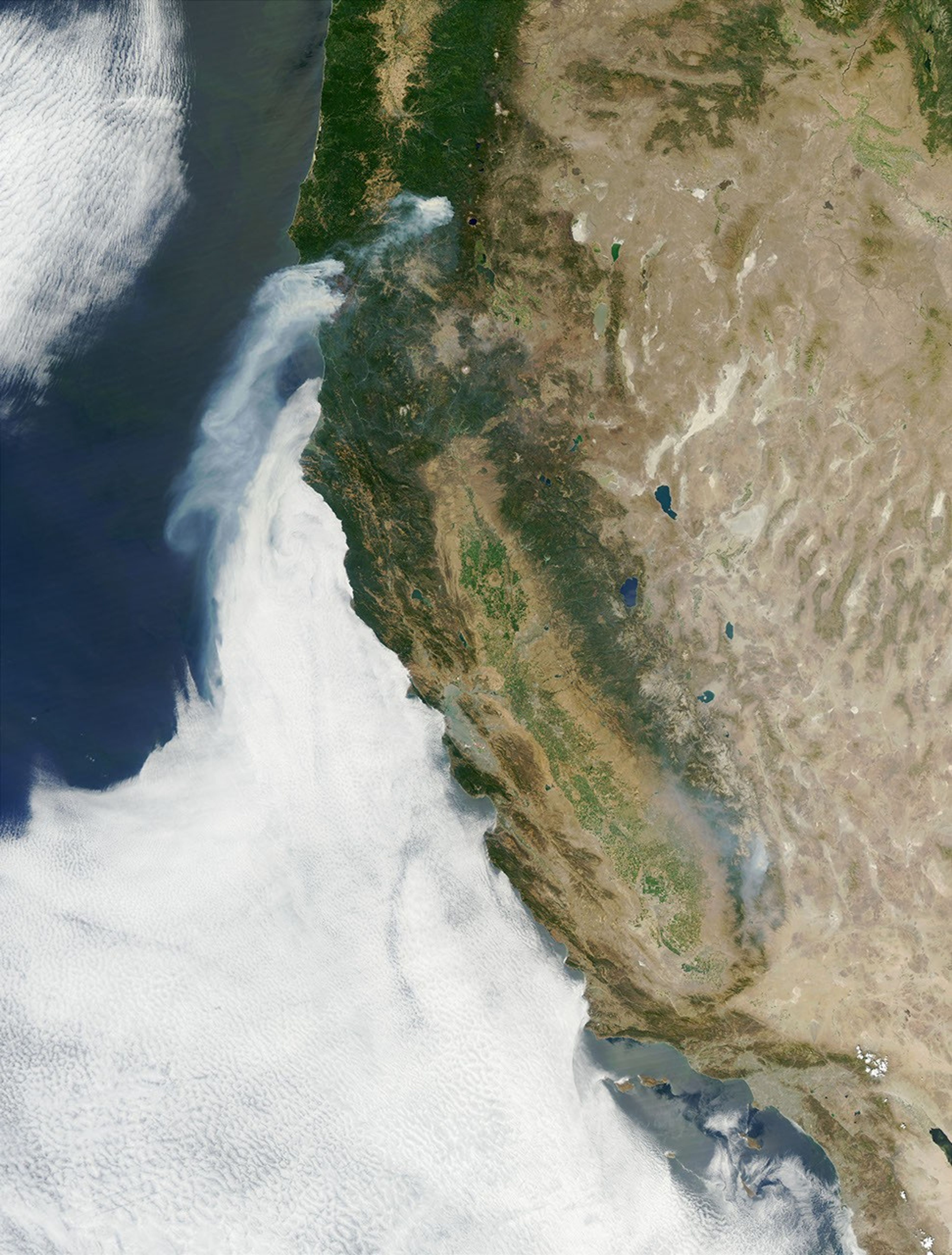 The image shows the Biscuit Fire, formed by the convergence of theFlorence Fire and the Sour Biscuit Fire.The fire was sparked by lightning in the KlamathMountains in Oregon and has burned over the state line into California,consuming over 375,000 acres as of August 14th, 2002. Actively burningareas are marked with red outlines.