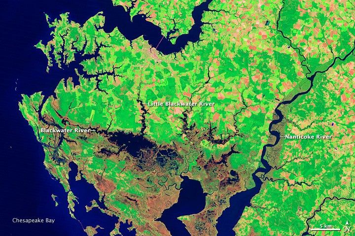 The Thematic Mapper (bands 7,4,2) on the Landsat 5 satellite acquired these images of Blackwater National Wildlife Refuge on Sept 21, 1984 (top) and August 31, 2011 (bottom). Infrared light is combined with visible light to help differentiate between muddy water, bare earth, and plant-covered ground in these images. Dry, vegetated areas appear bright green, and a patchwork of fallow and vegetated fields range in hue from coral to light green.