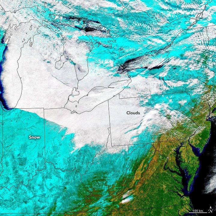 The bands of clouds streaming off the lakes, which form when cold air passes over open water, can produce lake-effect snow. While snowfall totals generally stayed below 5 inches (13 centimeters) in most areas touched by the storm, lake-effect snow caused totals to surge above 50 inches in communities east of Lake Ontario and Lake Erie in upstate New York—including Buffalo. In these areas, early winter storms are known for producing huge amounts of snow because the lakes often have not frozen over yet.
