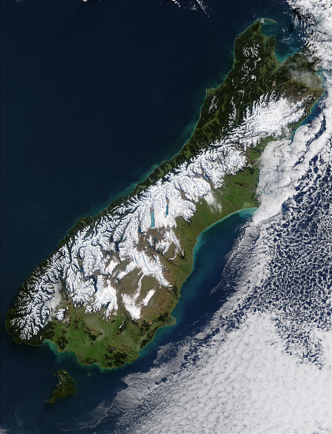 As the clouds broke over South Island, New Zealand, on July 11, 2003, clear skies revealed the blanket of snow that remained from what is being reported as the worst blizzard to hit the country in 50 years. The bright white snow contrasts sharply with the deep green vegetation of the coastal areas as well as with the bright blue, glacier-fed lakes scattered across the Southern Alps, which run diagonally across the island. The blizzard stranded hundreds of motorists and isolated more than 400 skiers at a mountain resort. In places, the storm brought ice and freezing rain, making roads especially treacherous and bringing down trees and power lines.