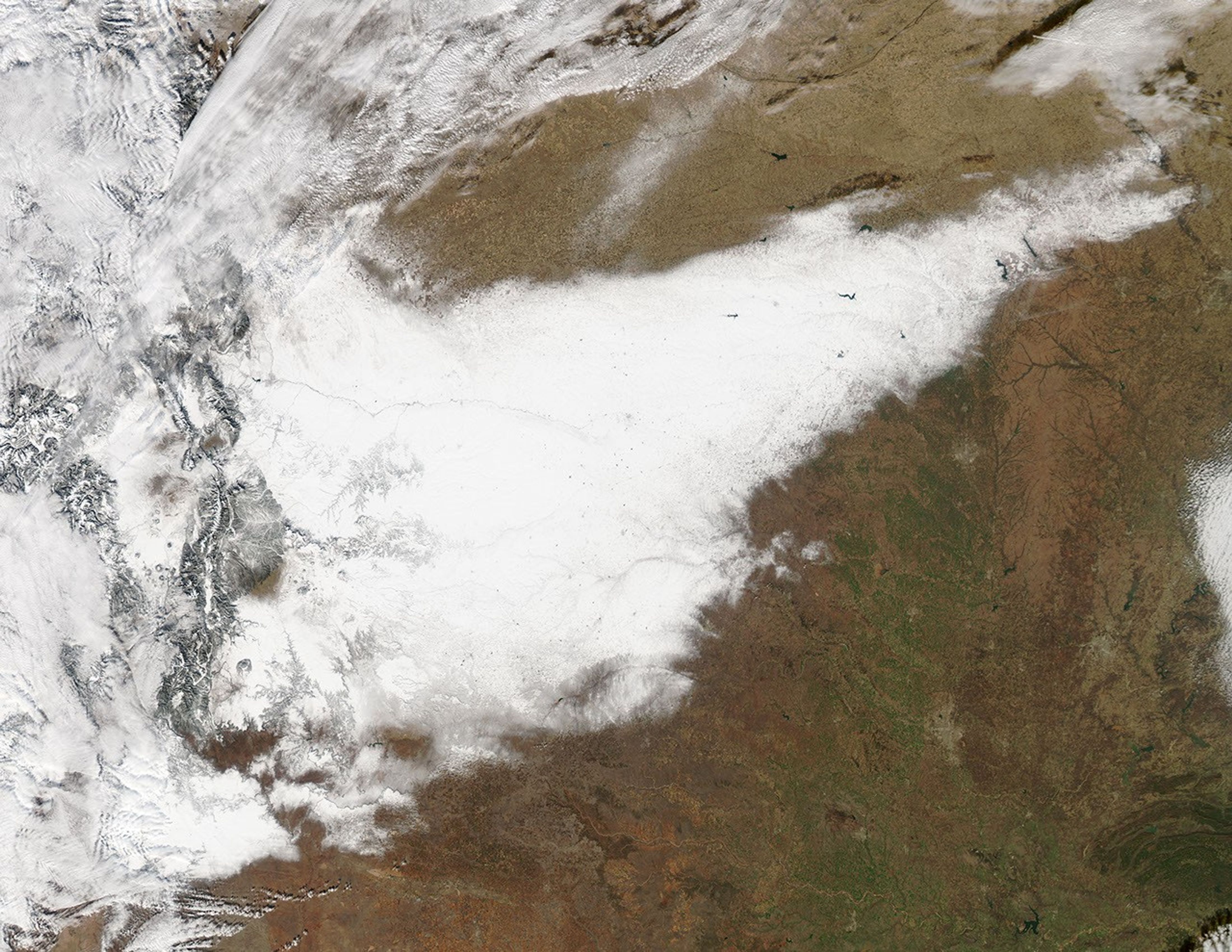 If you are hoping for a white Christmas this year, you may want to head south. A string of winter storms has left New Mexico, Colorado, and parts of the Southern Plains coated in white, while much of the rest of the United States remains snow free. The Moderate Resolution Imaging Spectroradiometer (MODIS) on NASA’s Aqua satellite acquired this image on December 21, after the clouds from the first storm had moved away and before a second storm arrived. A strip of snow extends from New Mexico to Kansas, revealing the track of the storm.