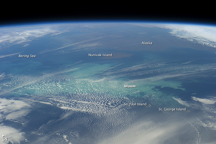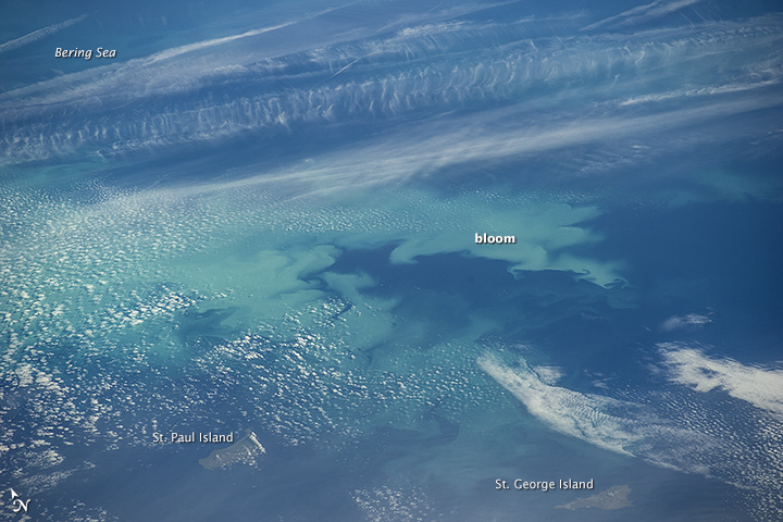 On September 4, 2014, the Moderate Resolution Imaging Spectroradiometer (MODIS) on NASA’s Aqua satellite acquired a natural-color image (top) of a bloom southwest of Nunivak Island and the coast of Alaska. The bloom was still visible a day later when astronauts aboard the International Space Station took photographs (below).