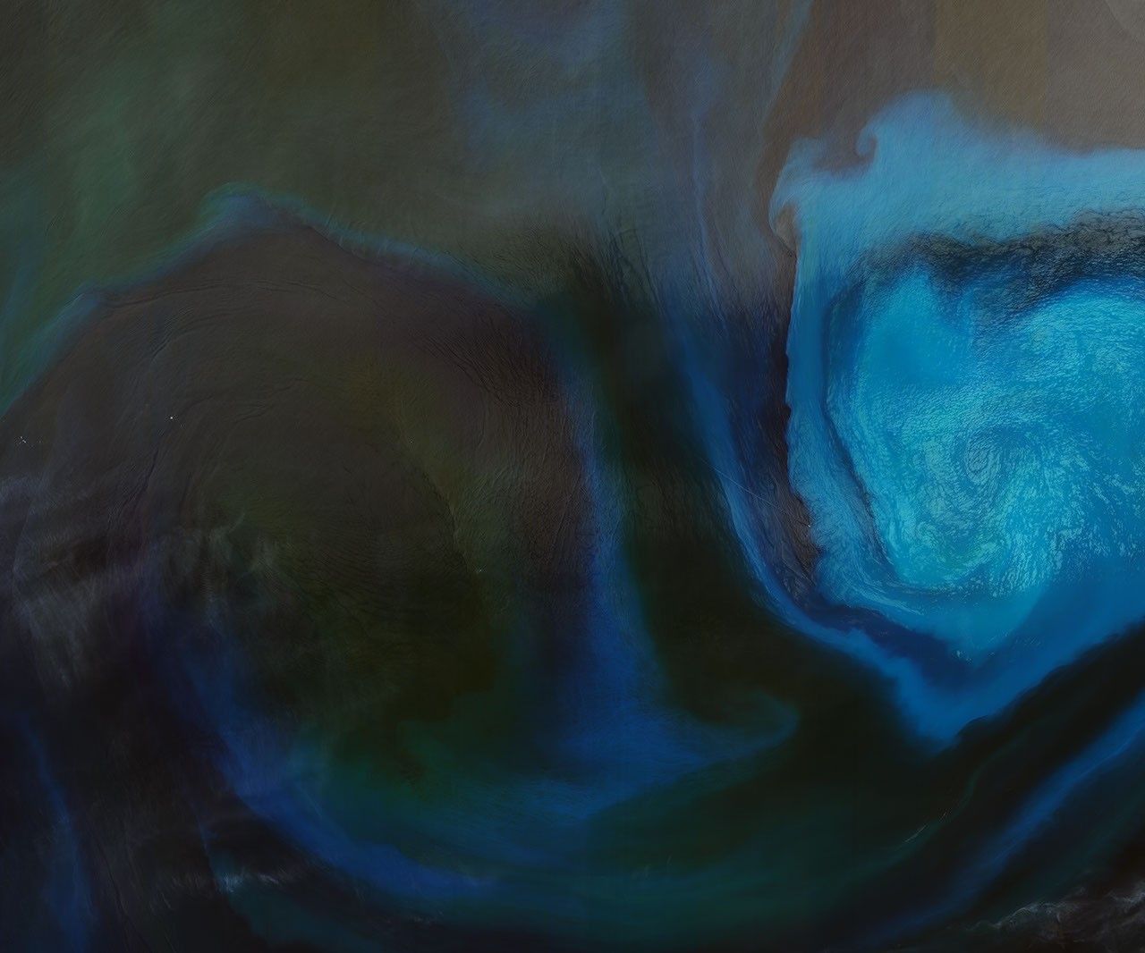 A phytoplankton bloom was under way on April 20, 2023, when the Moderate Resolution Imaging Spectroradiometer (MODIS) on NASA’s Aqua satellite acquired this image (top). The detailed image below was acquired the same day with the Operational Land Imager-2 (OLI-2) on Landsat 9.