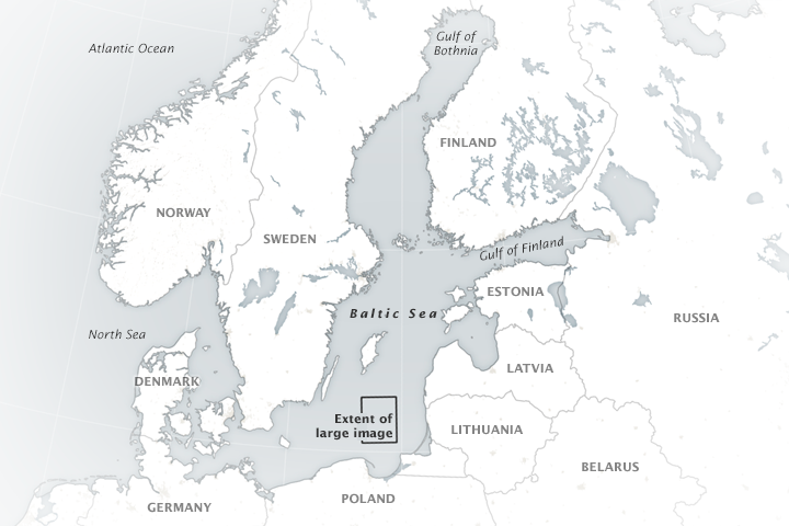 Satellite images alone cannot say definitively that this bloom contains cyanobacteria—analysis of ocean water samples would be required to confirm it. Yet, “major cyanobacteria blooms have appeared nearly every summer for a while now, and they always look like this in the satellite data,” explained NASA oceanographer Norman Kuring. Blooms like this flourish in the Baltic Sea during summertime, when there is ample sunlight and high levels of nutrients.