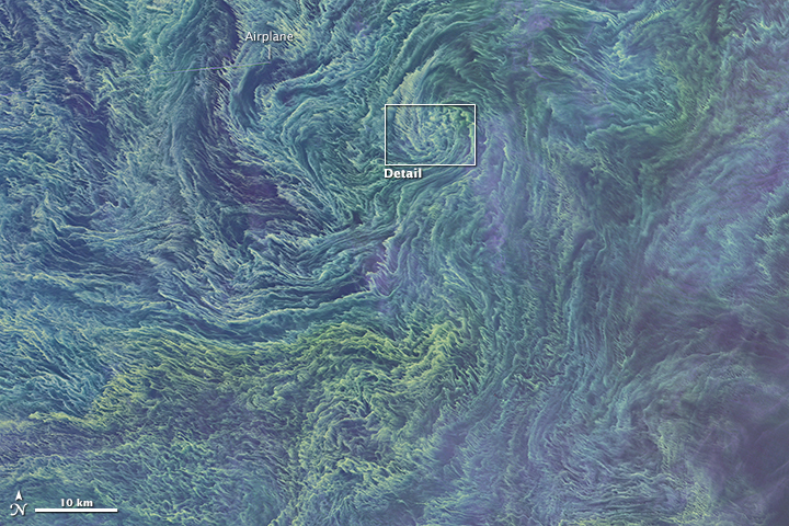 Voss’s vessel was not the only ship in the sea. Tracks of several other ships show up as dark lines where they have cut through the bloom in the large image. One of these ships is especially apparent in the top image, which shows a close-up view of part of the bloom. This vessel could be any number of ships that frequent the Baltic Sea. Cruise ships, for example, are often in the area, and they have been reported to play a role in contributing excess nutrients, through the dumping of sewage, that lead to the large, dense blooms.