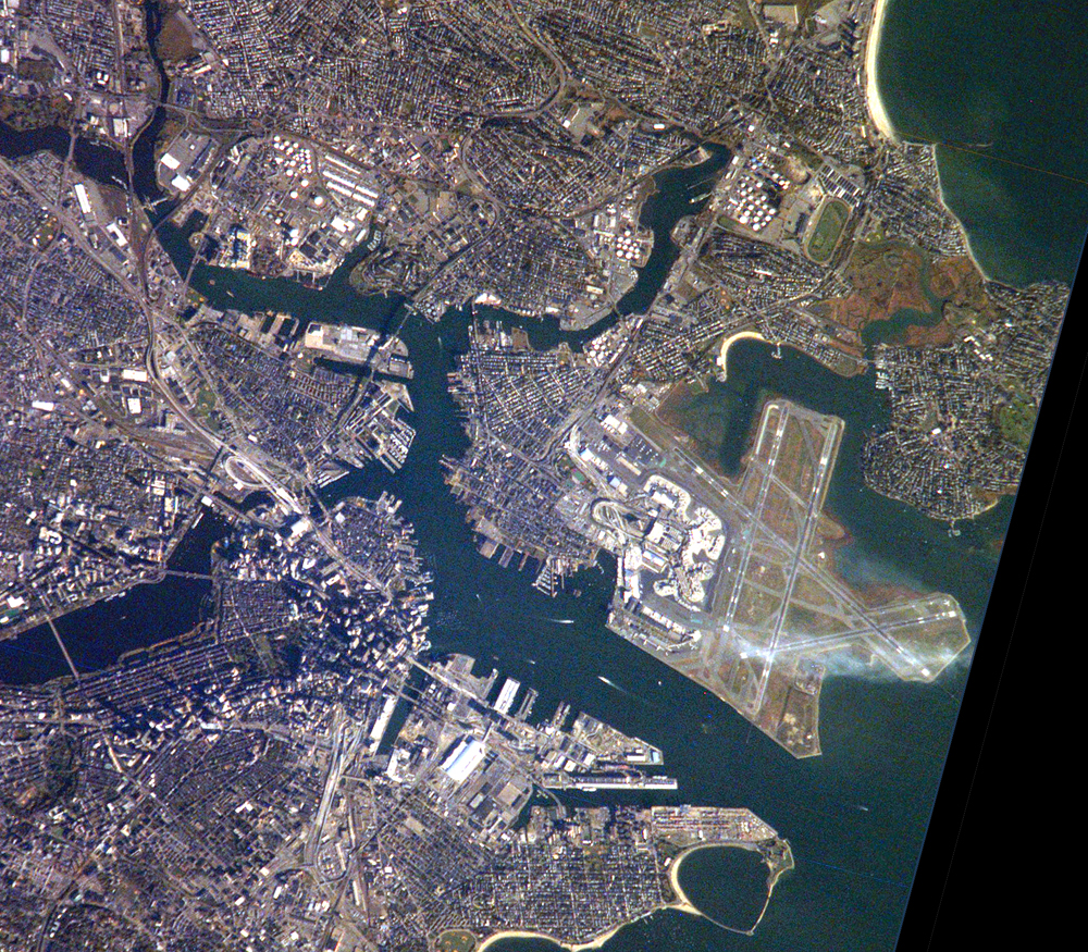 Were astronauts cheering the Red Sox from the International Space Station? Or enjoying New England’s fall colors on a fine fall day in mid October (the red color along the estuary north of Logan airport hints of the fall colors that the region enjoyed)? Or trying to observe Boston’s “Big Dig”, the local transportation project that is now the largest civil engineering project in U.S. history? Regardless of the reason, this image provides a good bird’s-eye view of the center of the city, including famous colonial and independence locations extending from Boston Common to the North End.