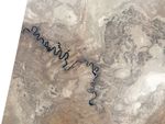 The river follows a long series of hairpin curves. On the outer loops of some curves, the river overflows onto nearby flood plains. (Two such overflows are obvious near the center of the image.) In the east, another overflow takes the approximate shape of a boot. Here the water has probably flowed onto agricultural fields.